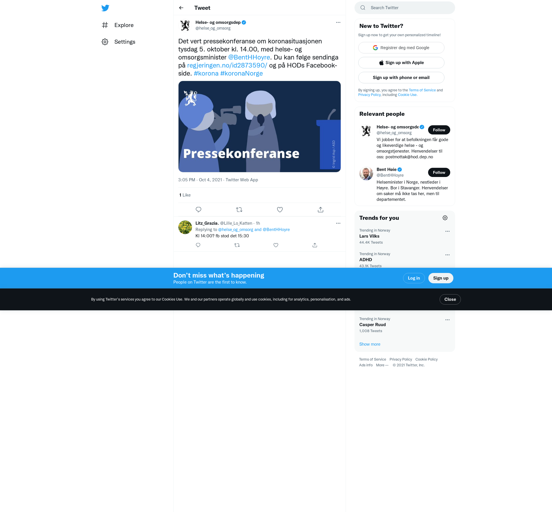 Invitasjon til pressekonferanse om koronasituasjonen tysdag 5. oktober kl. 14.00 med helse- og omsorgsminister Bent Høie og assisterande direktør i Folkehelseinstituttet Geir Bukholm.