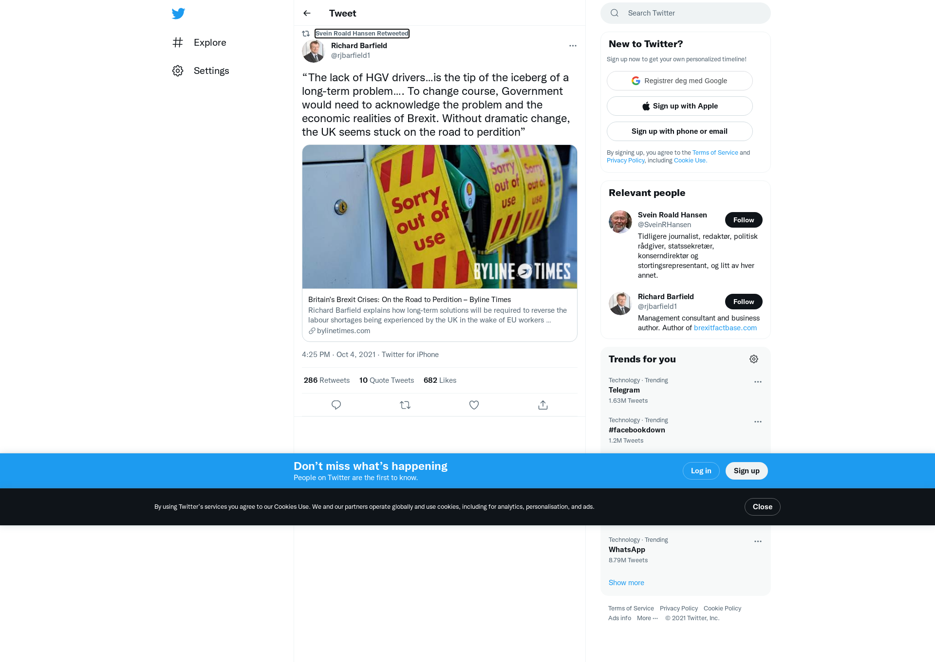 RT @rjbarfield1: “The lack of HGV drivers…is the tip of the iceberg of a long-term problem…. To change course, Government would need to acknowledge the problem and the economic realities of Brexit. Without dramatic change, the UK seems stuck on the road to perdition”