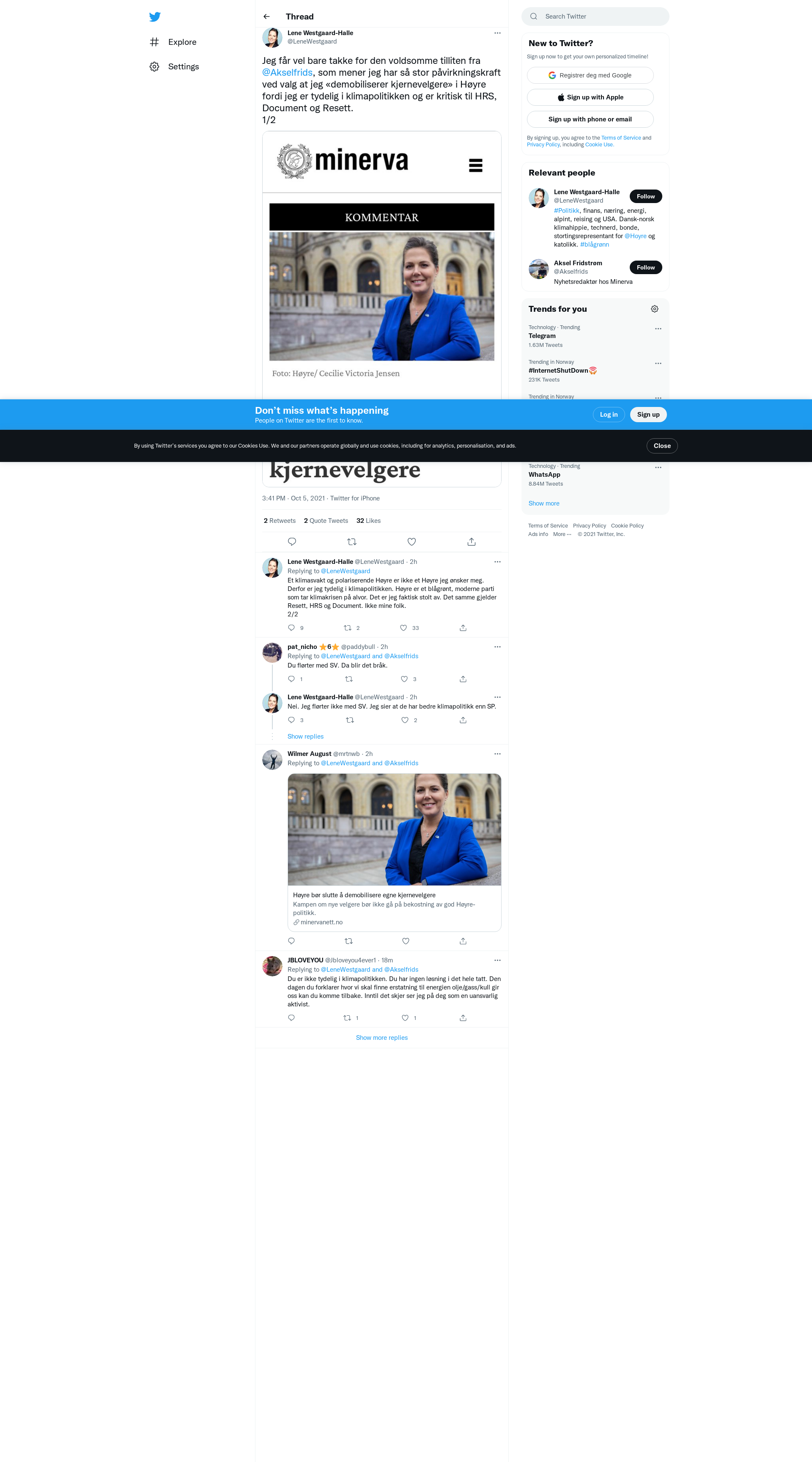 Jeg får vel bare takke for den voldsomme tilliten fra @Akselfrids, som mener jeg har så stor påvirkningskraft ved valg at jeg «demobiliserer kjernevelgere» i Høyre fordi jeg er tydelig i klimapolitikken og er kritisk til HRS, Document og Resett.