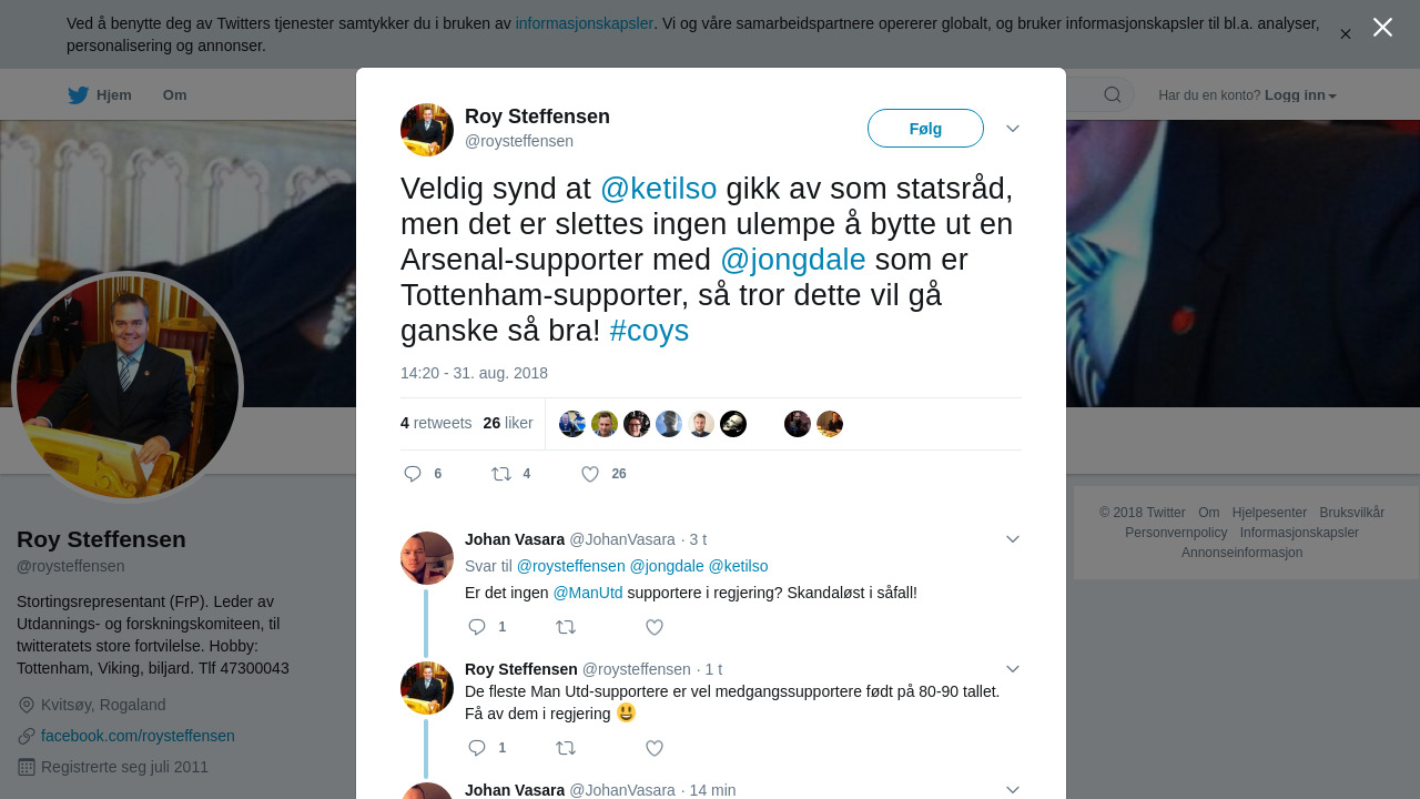 RT @roysteffensen: Veldig synd at @ketilso gikk av som statsråd, men det er slettes ingen ulempe å bytte ut en Arsenal-supporter med @jongdale som er Tottenham-supporter, så tror dette vil gå ganske så bra! #coys