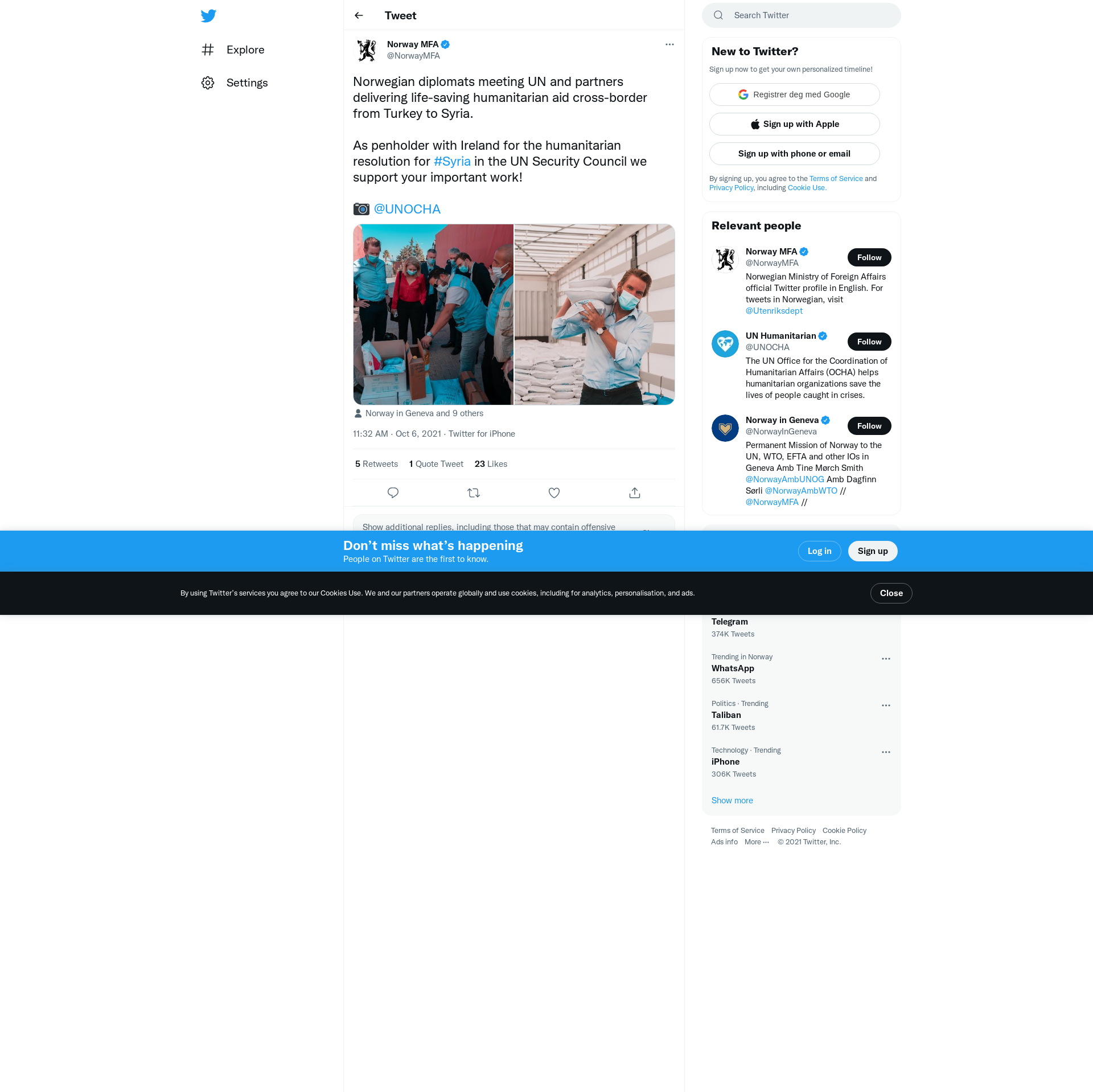 Norwegian diplomats meeting UN and partners delivering life-saving humanitarian aid cross-border from Turkey to Syria.