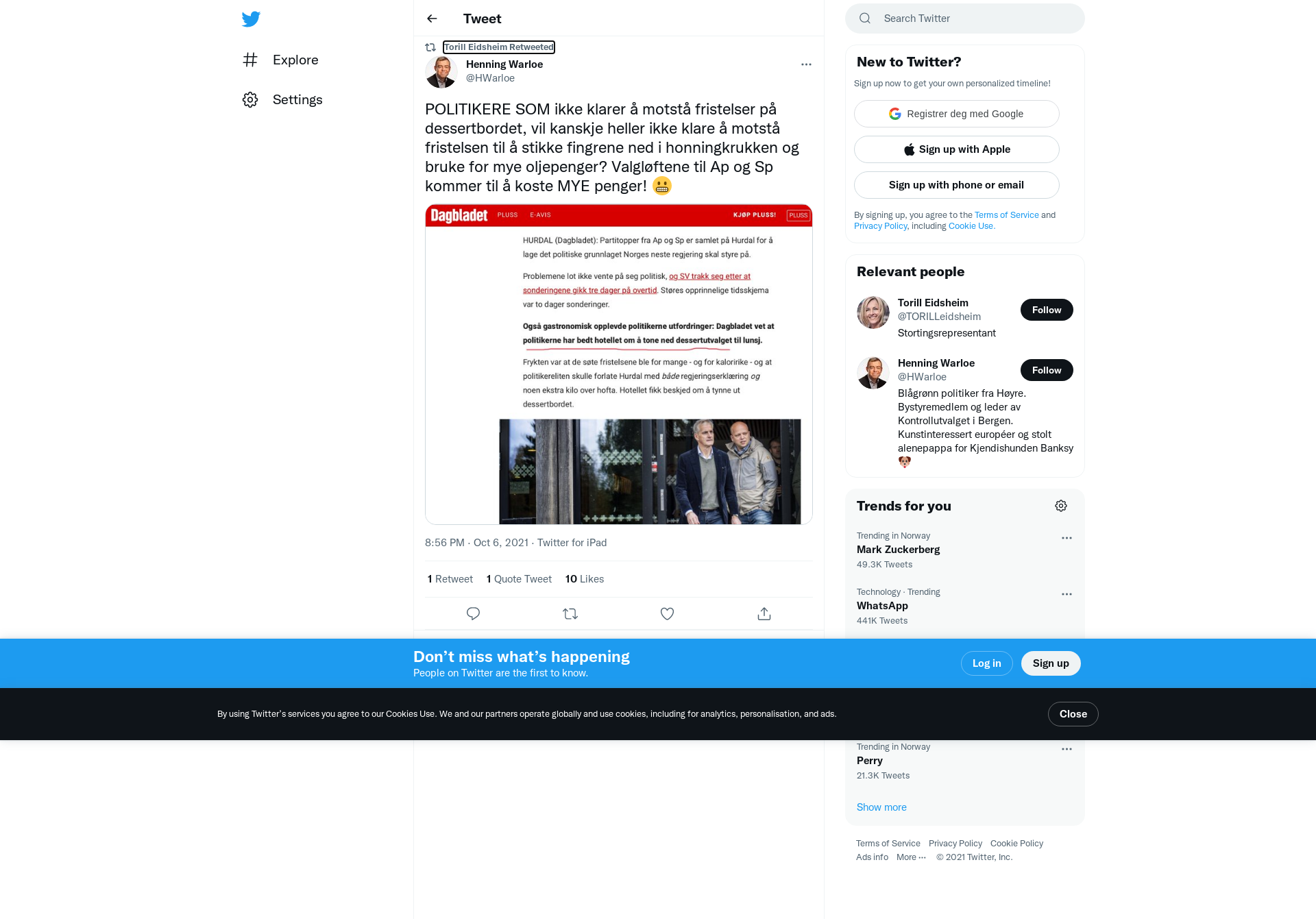 RT @HWarloe: POLITIKERE SOM ikke klarer å motstå fristelser på dessertbordet, vil kanskje heller ikke klare å motstå fristelsen til å stikke fingrene ned i honningkrukken og bruke for mye oljepenger? Valgløftene til Ap og Sp kommer til å koste MYE penger! 😬 https://t.co/rieupg9Fow