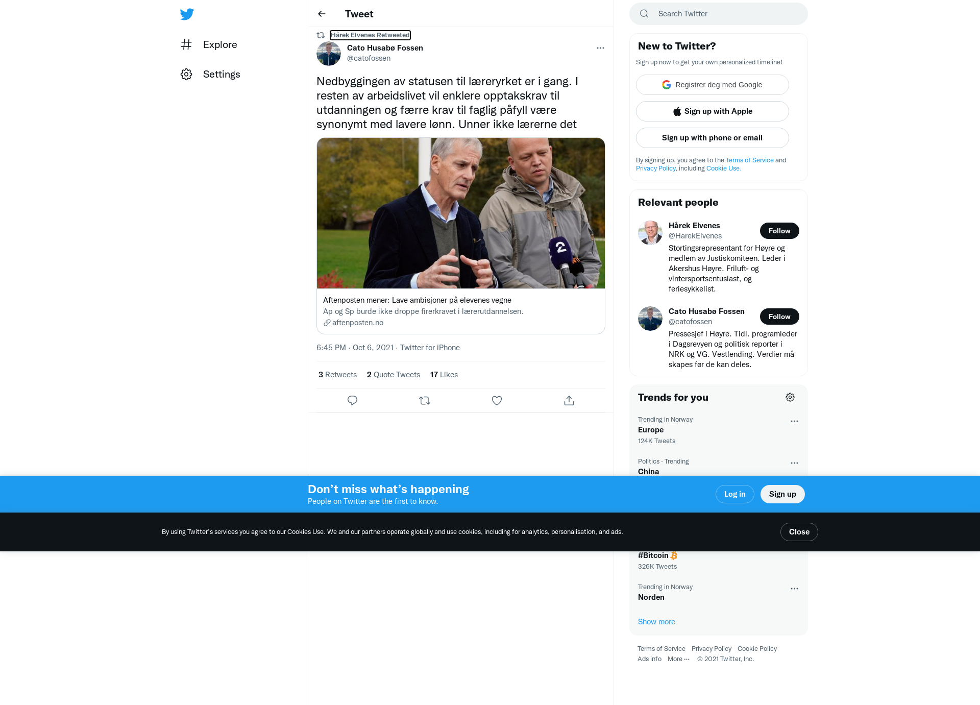 RT @catofossen: Nedbyggingen av statusen til læreryrket er i gang. I resten av arbeidslivet vil enklere opptakskrav til utdanningen og færre krav til faglig påfyll være synonymt med lavere lønn. Unner ikke lærerne det https://t.co/GsHnoZwaVl