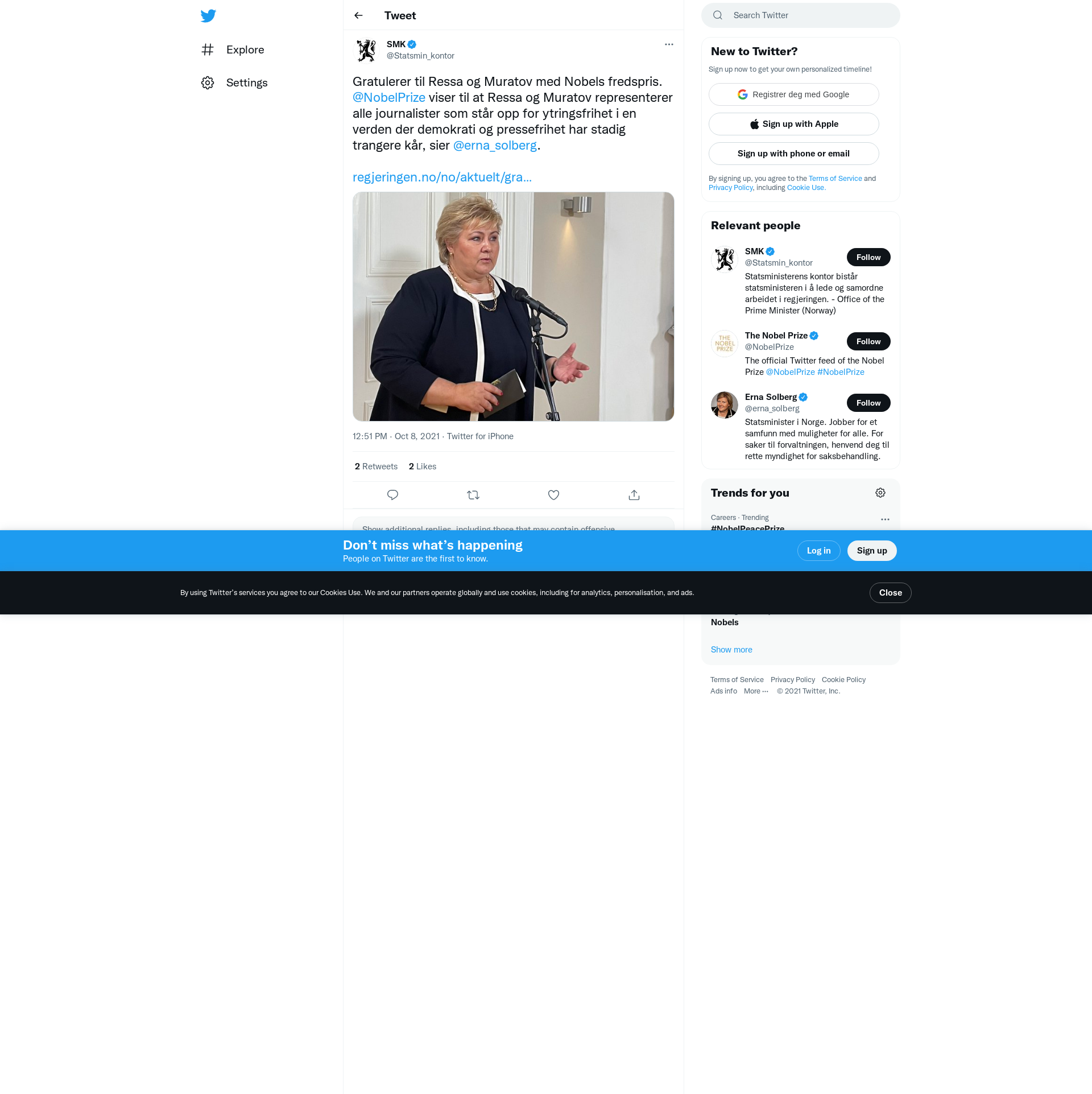 Gratulerer til Ressa og Muratov med Nobels fredspris. @NobelPrize viser til at Ressa og Muratov representerer alle journalister som står opp for ytringsfrihet i en verden der demokrati og pressefrihet har stadig trangere kår, sier @erna_solberg.