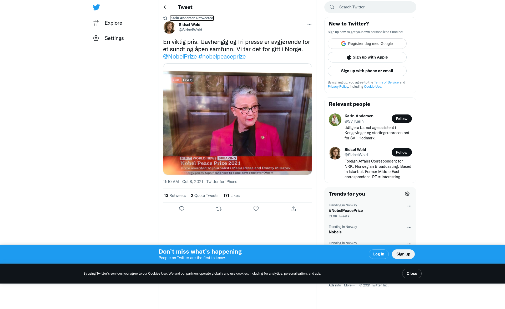 RT @SidselWold: En viktig pris. Uavhengig og fri presse er avgjørende for et sundt og åpen samfunn. Vi tar det for gitt i Norge. @NobelPrize #nobelpeaceprize https://t.co/ZmWiDoY1yp