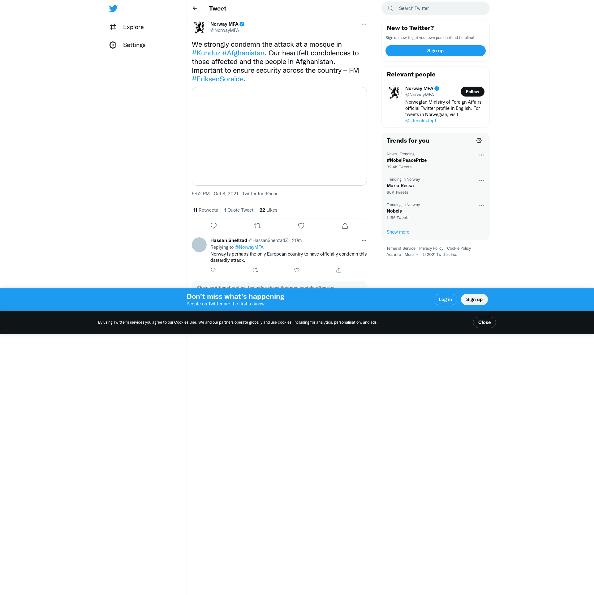 We strongly condemn the attack at a mosque in #Kunduz #Afghanistan. Our heartfelt condolences to those affected and the people in Afghanistan. Important to ensure security across the country – FM #EriksenSoreide. https://t.co/6NXhp2XD7p