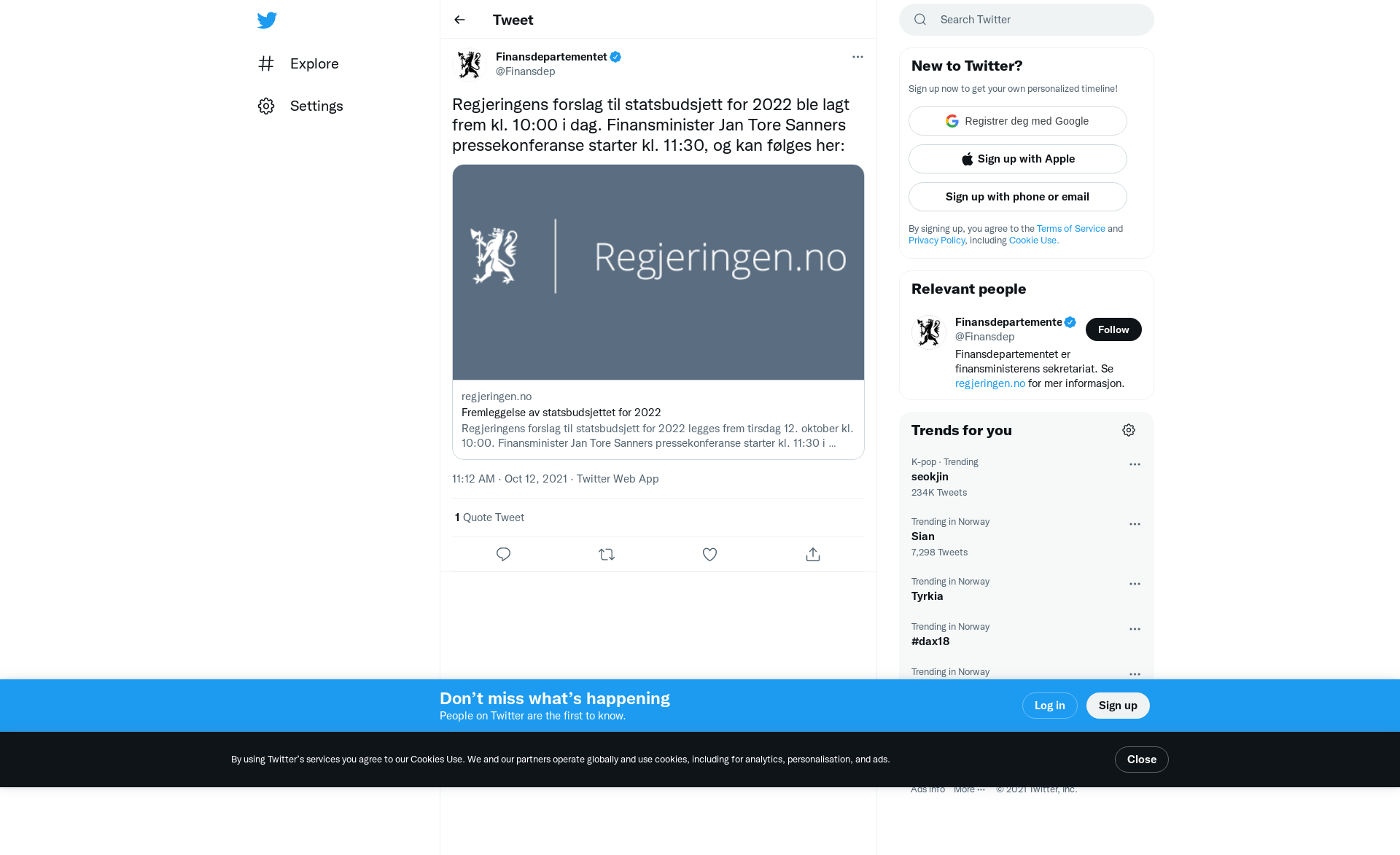 Regjeringens forslag til statsbudsjett for 2022 ble lagt frem kl. 10:00 i dag. Finansminister Jan Tore Sanners pressekonferanse starter kl. 11:30, og kan følges her: https://t.co/569eE6Hw4z