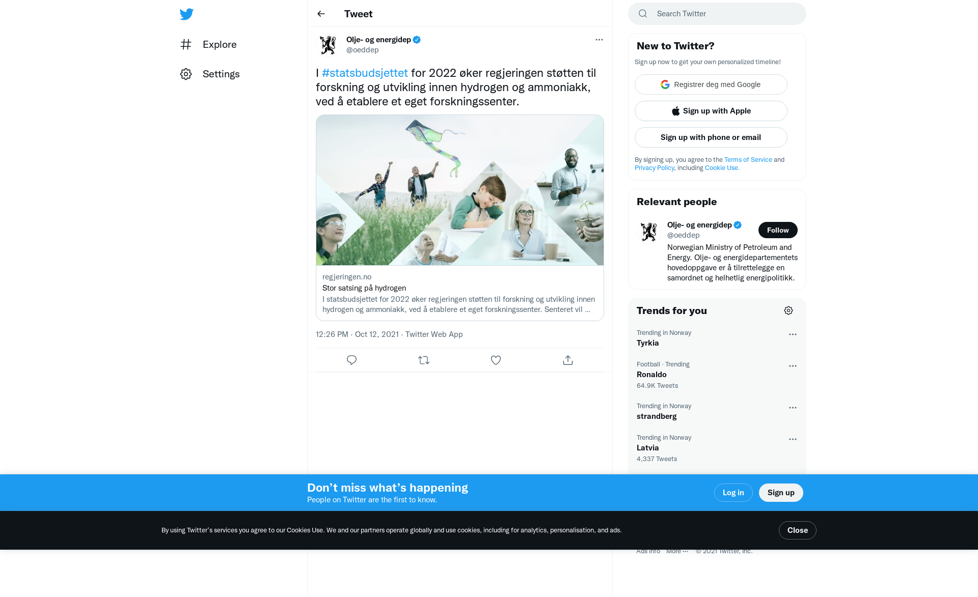 I statsbudsjettet for 2022 øker regjeringen støtten til forskning og utvikling innen hydrogen og ammoniakk, ved å etablere et eget forskningssenter. Senteret vil motta en årlig bevilgning fra Olje- og energidepartementet på 30 millioner kroner i opptil...