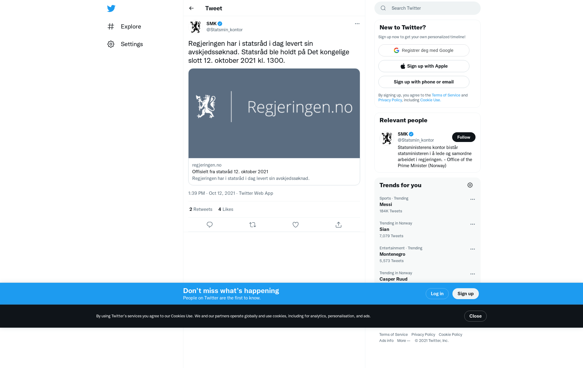 Regjeringen har i statsråd i dag levert sin avskjedssøknad. Statsråd ble holdt på Det kongelige slott 12. oktober 2021 kl. 1300. https://t.co/f1hcSrf6qO