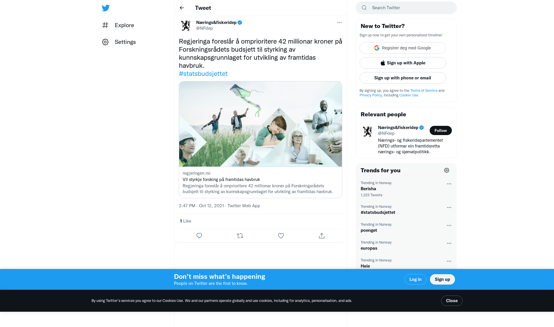 Regjeringa foreslår å omprioritere 42 millionar kroner på Forskningsrådets budsjett til styrking av kunnskapsgrunnlaget for utvikling av framtidas havbruk.