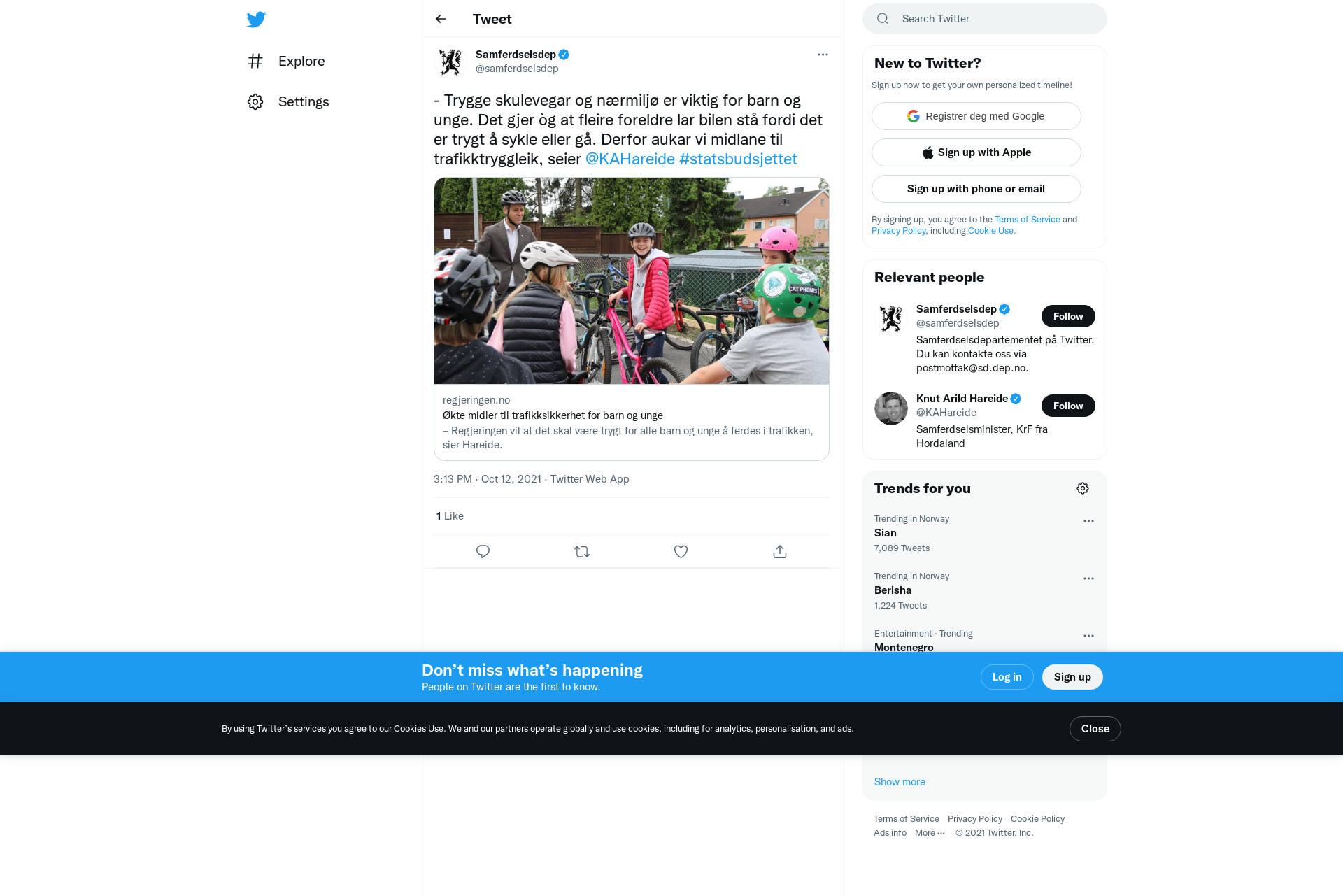 - Trygge skulevegar og nærmiljø er viktig for barn og unge. Det gjer òg at fleire foreldre lar bilen stå fordi det er trygt å sykle eller gå. Derfor aukar vi midlane til trafikktryggleik, seier @KAHareide #statsbudsjettet https://t.co/qGGOFM9Zwk