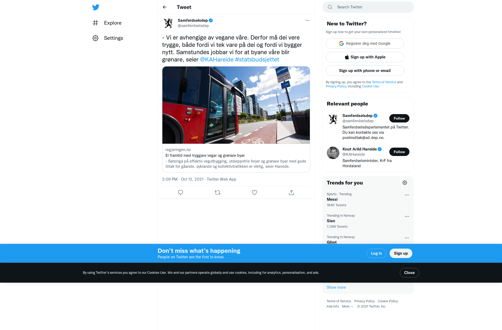 - Vi er avhengige av vegane våre. Derfor må dei vere trygge, både fordi vi tek vare på dei og fordi vi bygger nytt. Samstundes jobbar vi for at byane våre blir grønare, seier @KAHareide #statsbudsjettet https://t.co/5zGVWMJg12