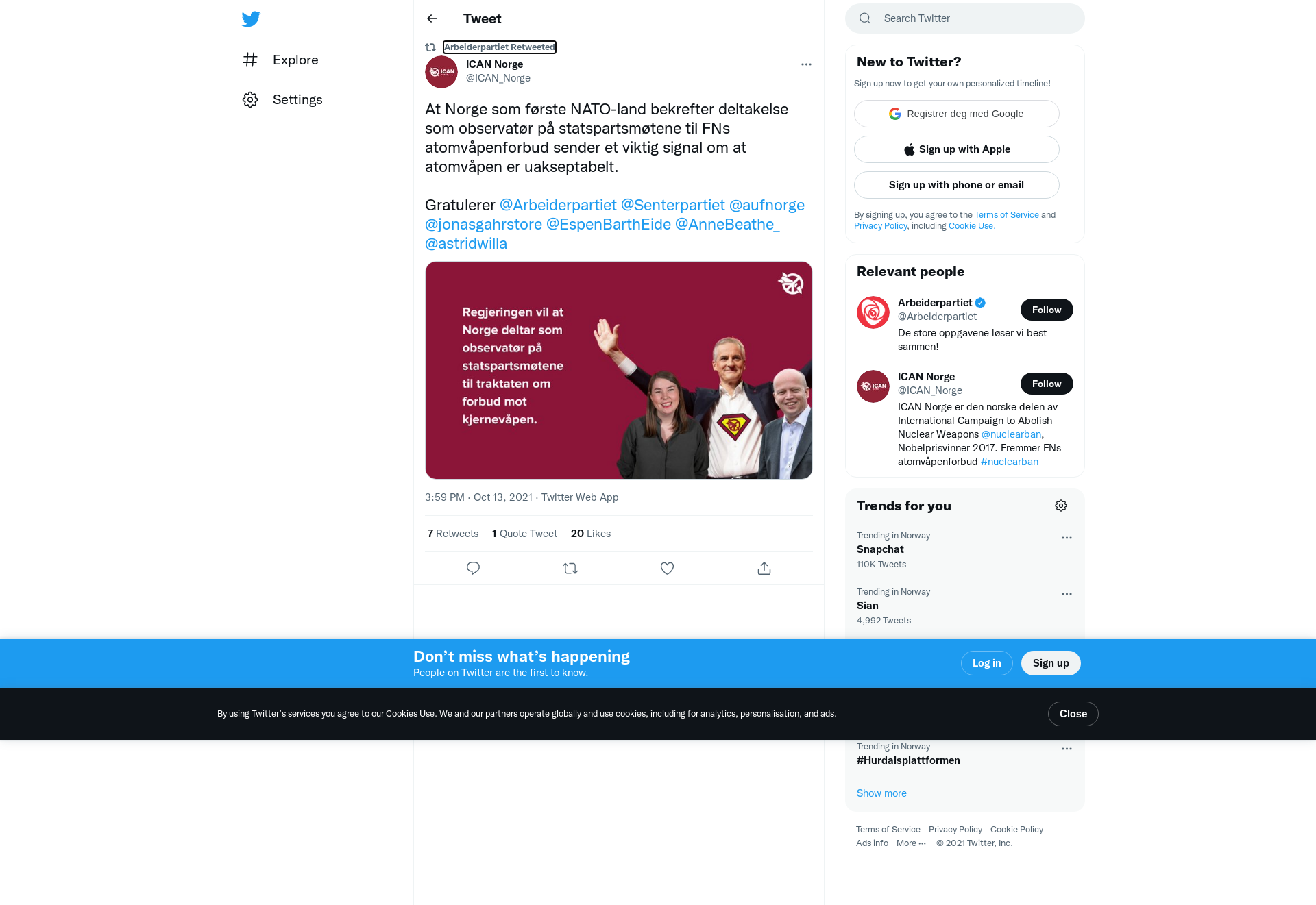 RT @ICAN_Norge: At Norge som første NATO-land bekrefter deltakelse som observatør på statspartsmøtene til FNs atomvåpenforbud sender et viktig signal om at atomvåpen er uakseptabelt.
