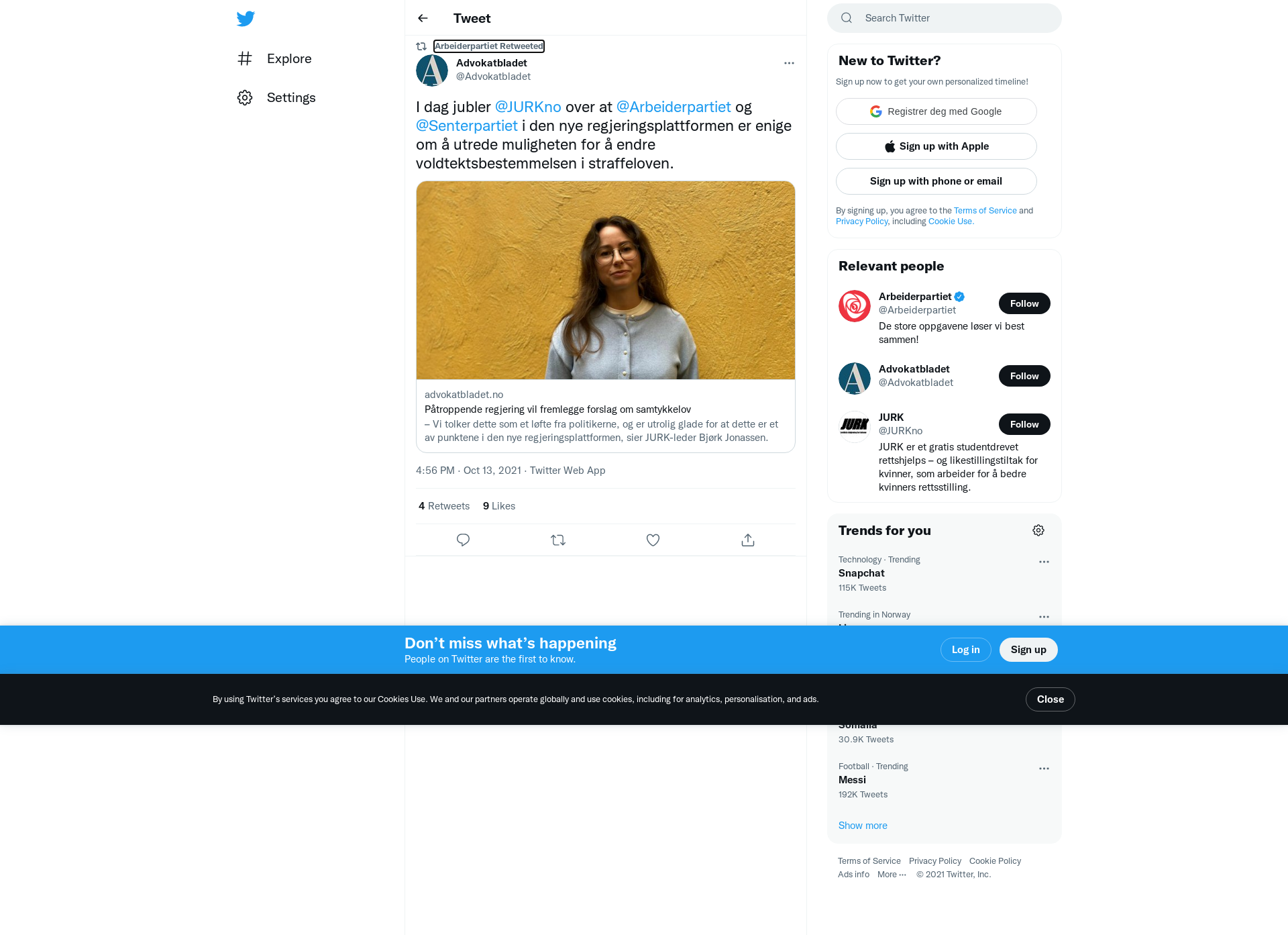 RT @Advokatbladet: I dag jubler @JURKno over at @Arbeiderpartiet og @Senterpartiet i den nye regjeringsplattformen er enige om å utrede muligheten for å endre voldtektsbestemmelsen i straffeloven.