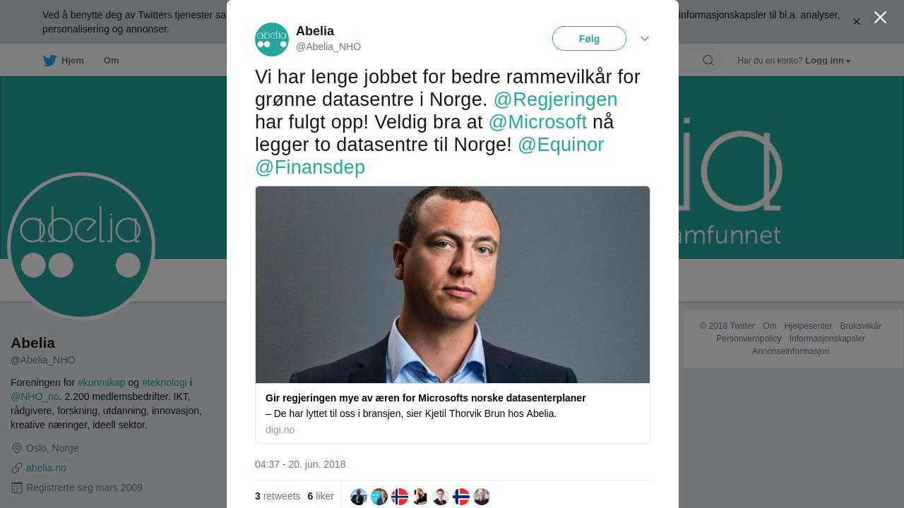 RT @Abelia_NHO: Vi har lenge jobbet for bedre rammevilkår for grønne datasentre i Norge. @Regjeringen har fulgt opp! Veldig bra at… https://t.co/OEBgnYtgoc