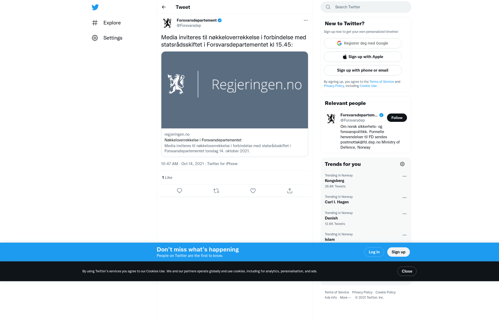 Media inviteres til nøkkeloverrekkelse i forbindelse med statsrådsskiftet i Forsvarsdepartementet torsdag 14. oktober 2021.