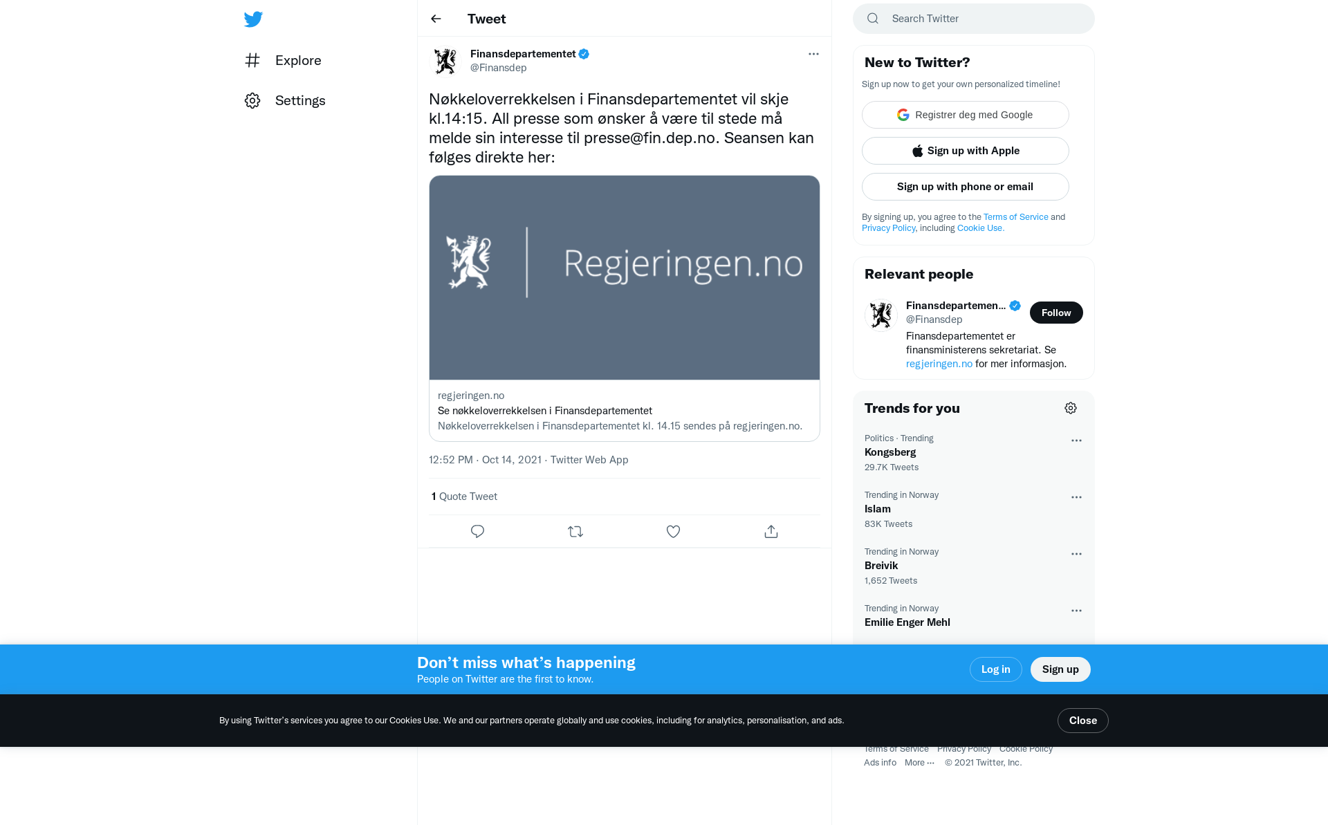 Nøkkeloverrekkelsen i Finansdepartementet vil skje kl.14:15. All presse som ønsker å være til stede må melde sin interesse til presse@fin.dep.no. Seansen kan følges direkte her: https://t.co/Vpxc1rmaTW