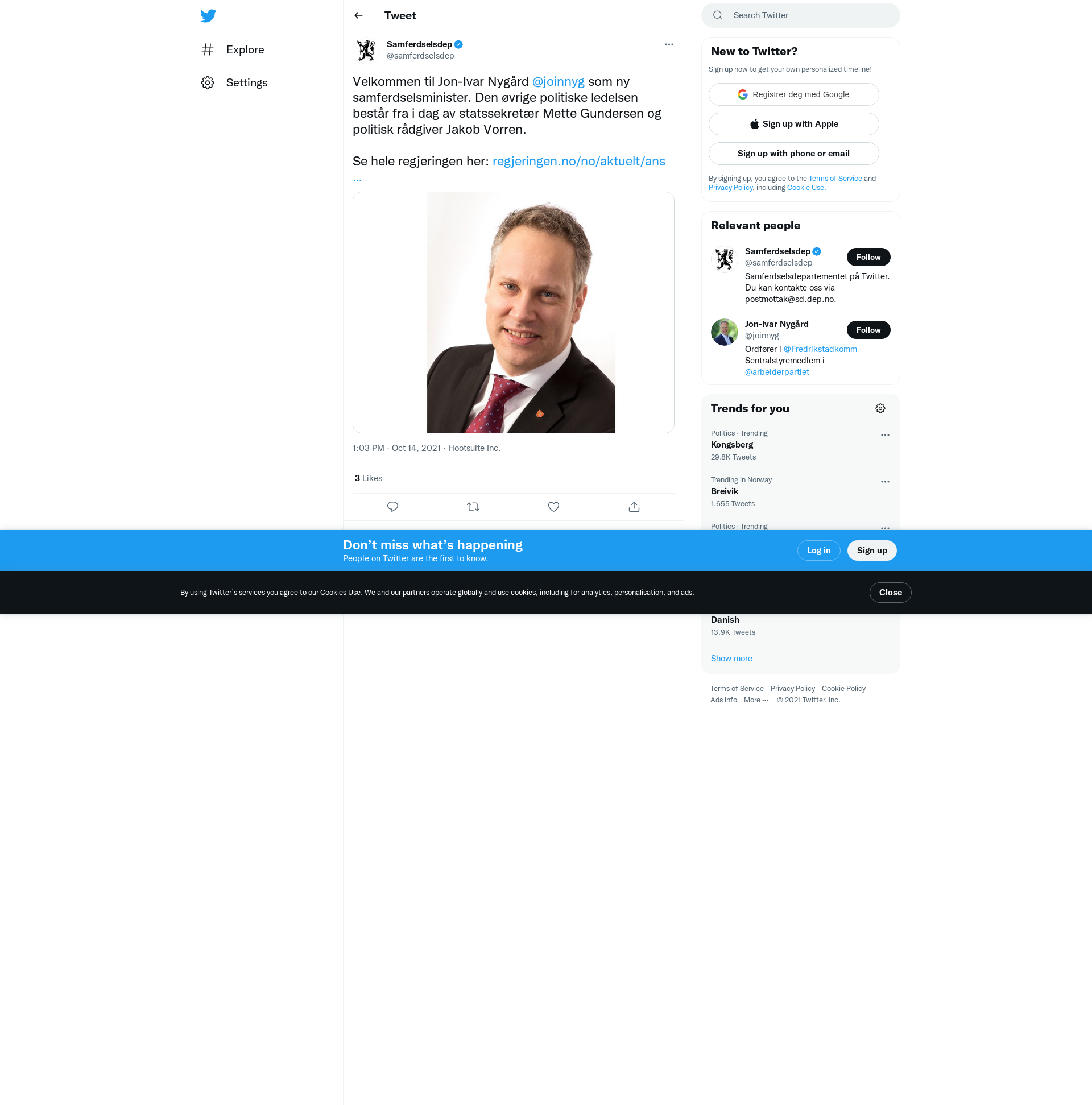 Velkommen til Jon-Ivar Nygård @joinnyg som ny samferdselsminister. Den øvrige politiske ledelsen består fra i dag av statssekretær Mette Gundersen og politisk rådgiver Jakob Vorren.