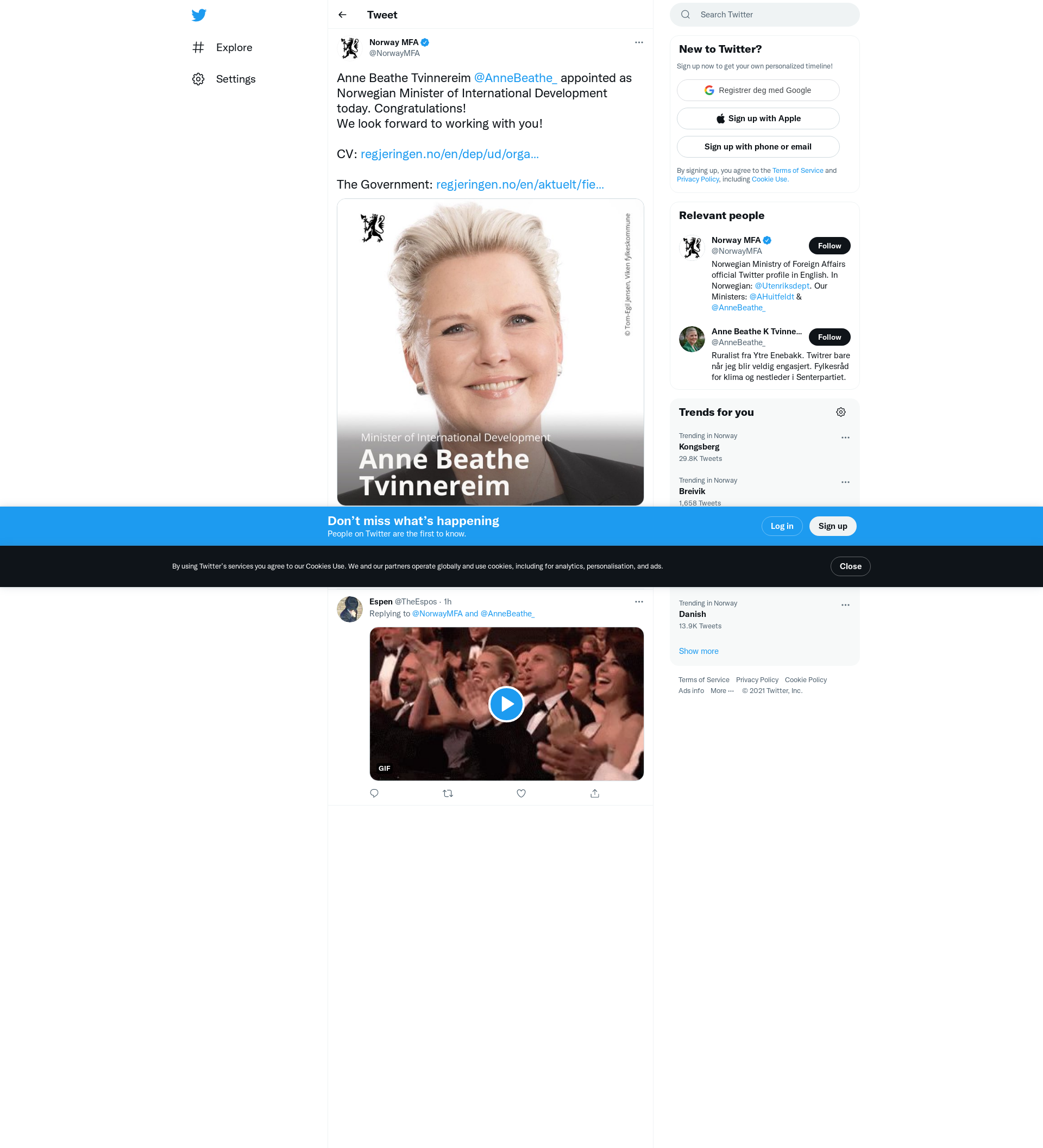 Anne Beathe Tvinnereim @AnneBeathe_ appointed as Norwegian Minister of International Development today. Congratulations!