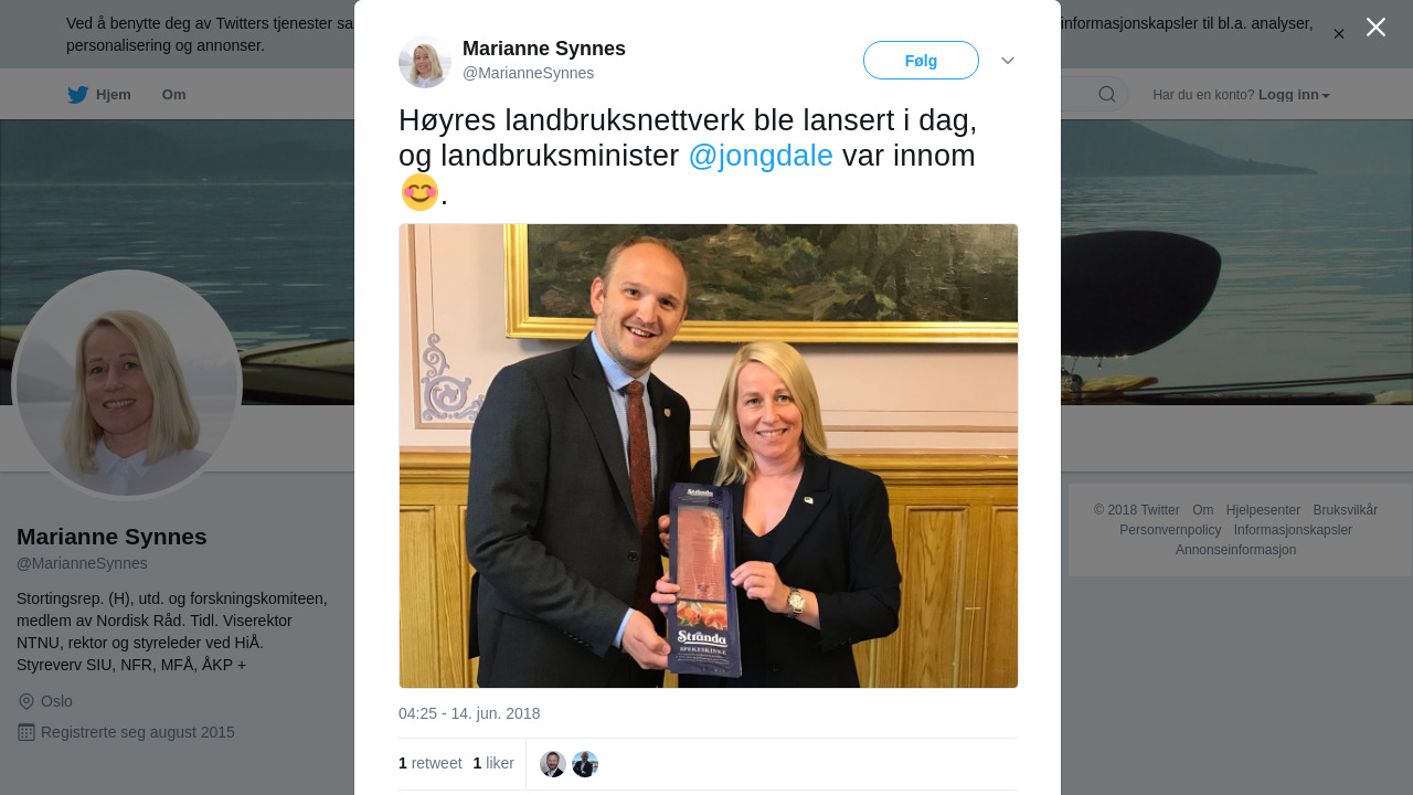 RT @MarianneSynnes: Høyres landbruksnettverk ble lansert i dag, og landbruksminister @jongdale var innom 😊. https://t.co/6FibzbwivN