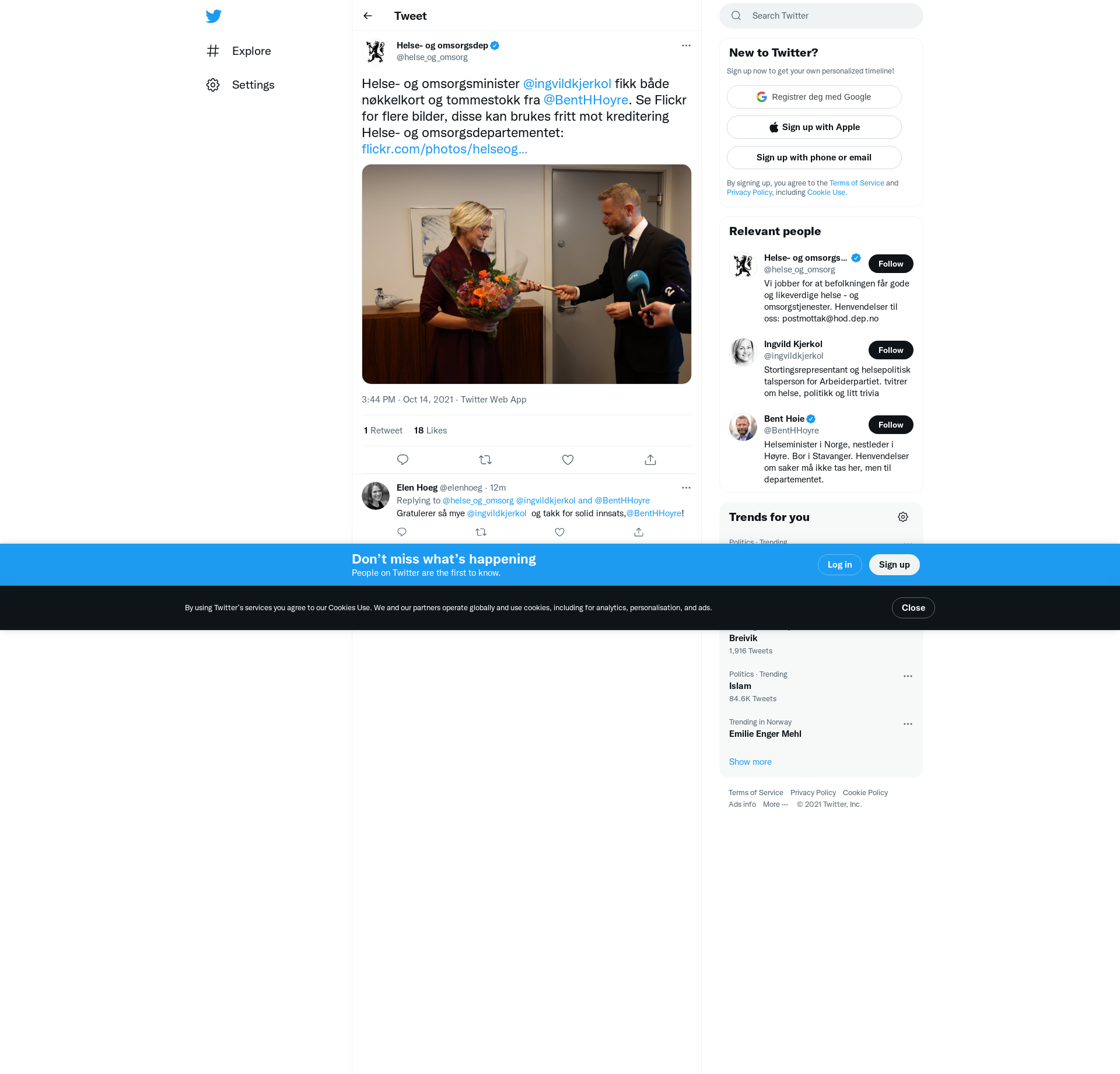 Torsdag 14. oktober ble Ingvild Kjerkol utnevnt til Helse- og omsorgsminister i regjeringen Støre. Kjerkol kom til departementet kl. 15.00, der hun først hilste på departementsråd og ekspedisjonssjefer, før det var nøkkeloverrekkelse fra Bent Høie.