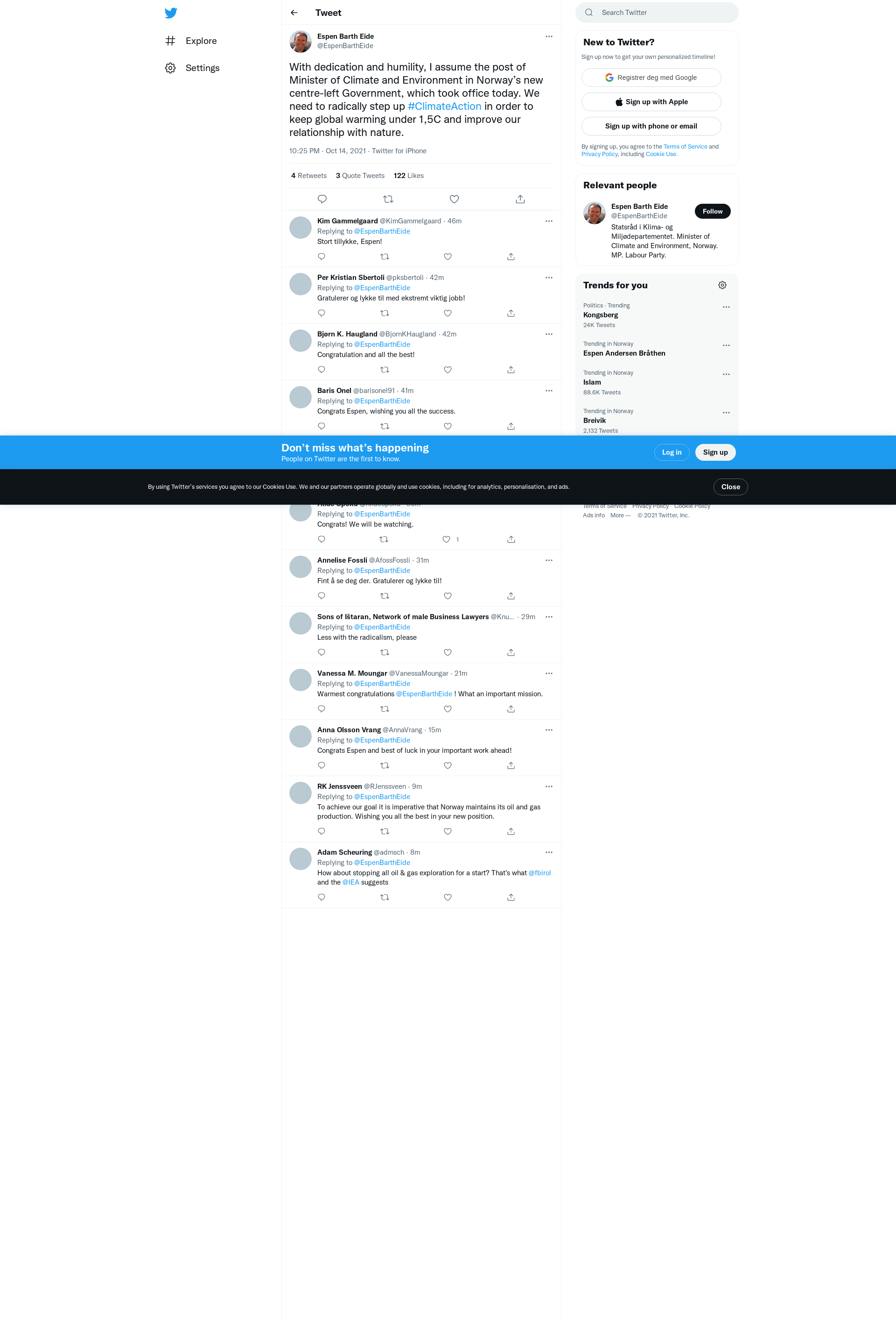 With dedication and humility, I assume the post of Minister of Climate and Environment in Norway’s new centre-left Government, which took office today. We need to radically step up #ClimateAction in order to keep global warming under 1,5C and improve our relationship with nature.
