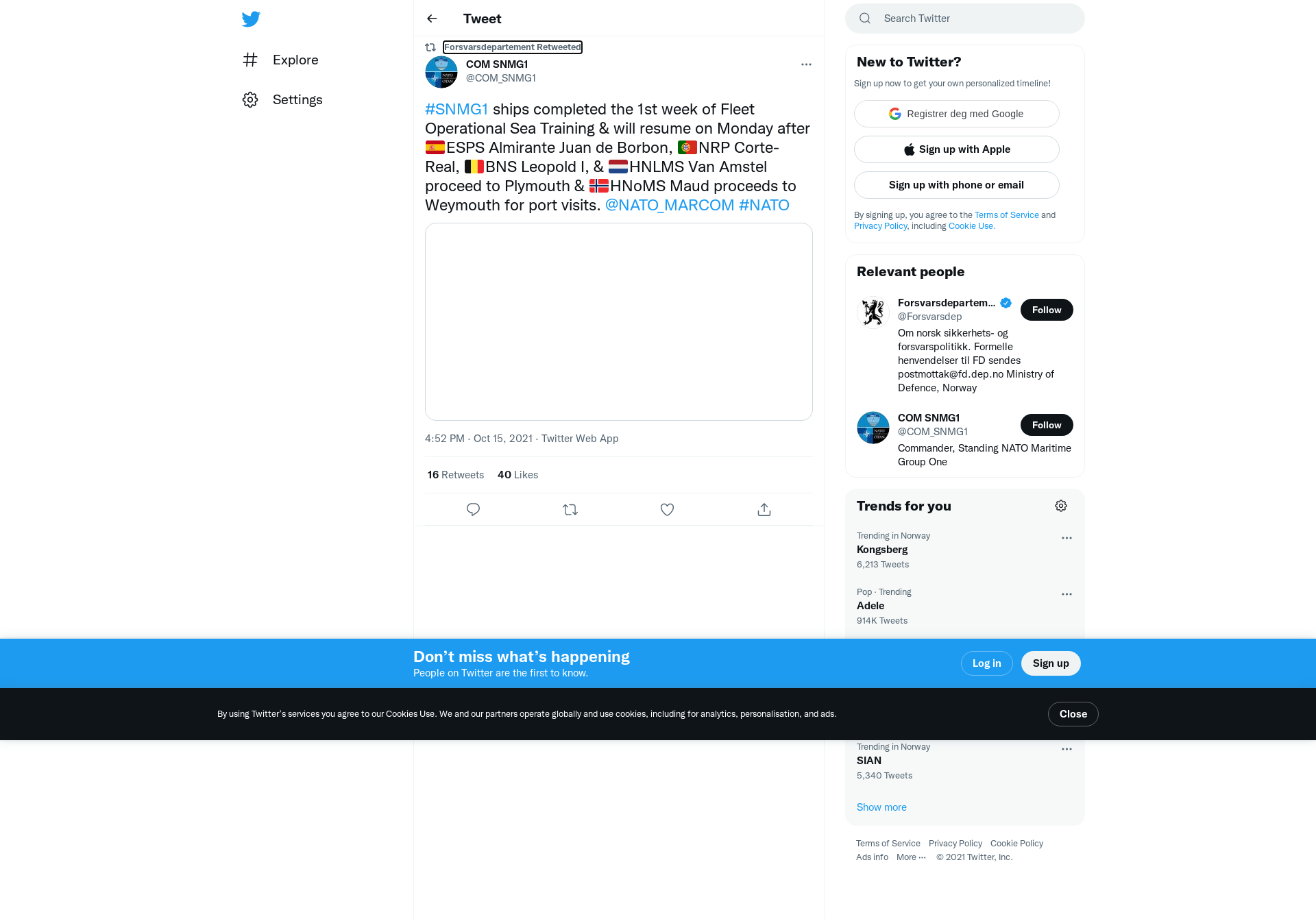 RT @COM_SNMG1: #SNMG1 ships completed the 1st week of Fleet Operational Sea Training & will resume on Monday after 🇪🇸ESPS Almirante Juan de Borbon, 🇵🇹NRP Corte-Real, 🇧🇪BNS Leopold I, & 🇳🇱HNLMS Van Amstel proceed to Plymouth & 🇳🇴HNoMS Maud proceeds to Weymouth for port visits. @NATO_MARCOM #NATO https://t.co/yB3DUbaMMB