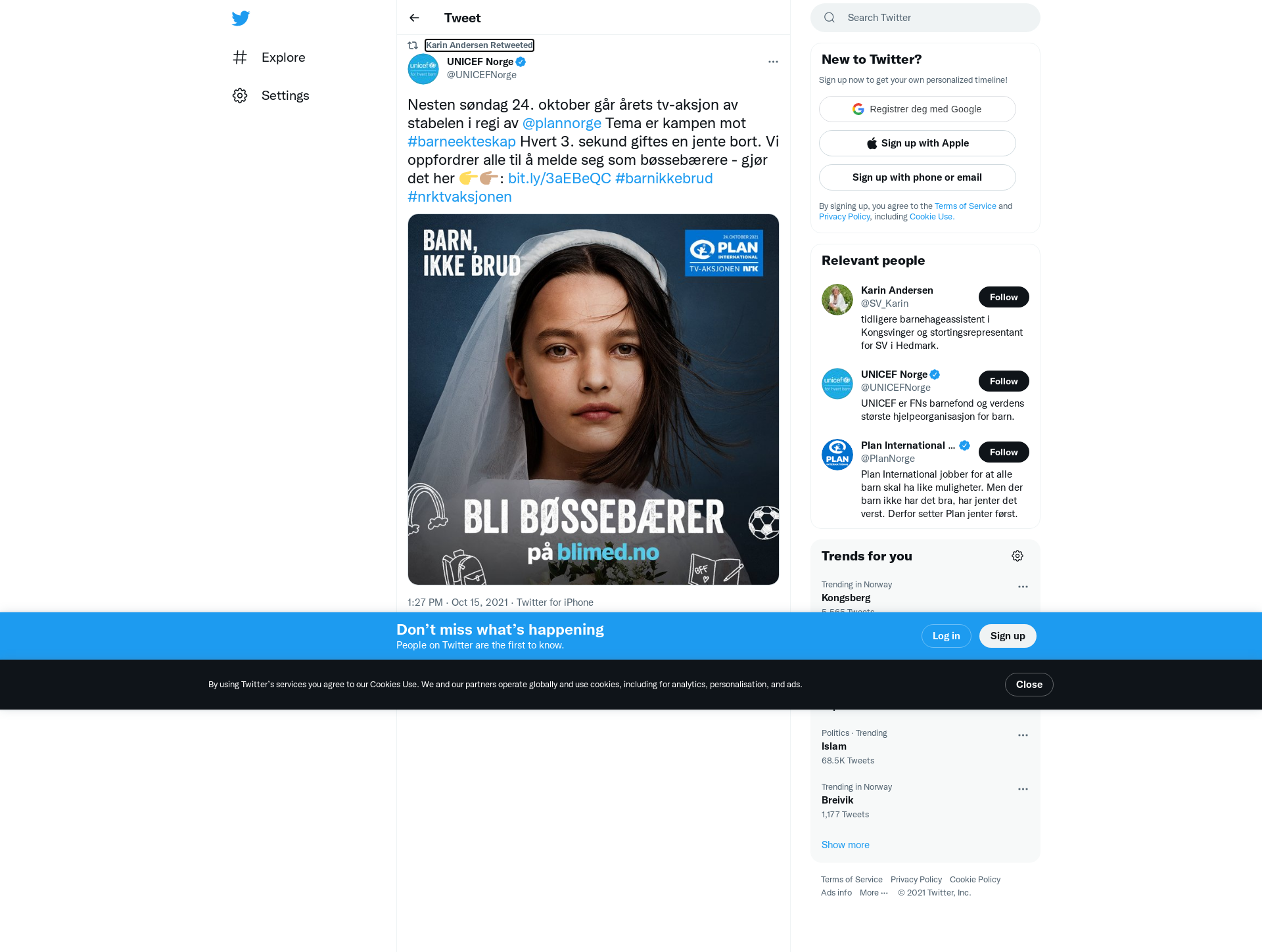 RT @UNICEFNorge: Nesten søndag 24. oktober går årets tv-aksjon av stabelen i regi av @plannorge Tema er kampen mot #barneekteskap Hvert 3. sekund giftes en jente bort. Vi oppfordrer alle til å melde seg som bøssebærere - gjør det her 👉👉🏽: https://t.co/kpli1UcuYA #barnikkebrud #nrktvaksjonen https://t.co/AIn0Qd6N13