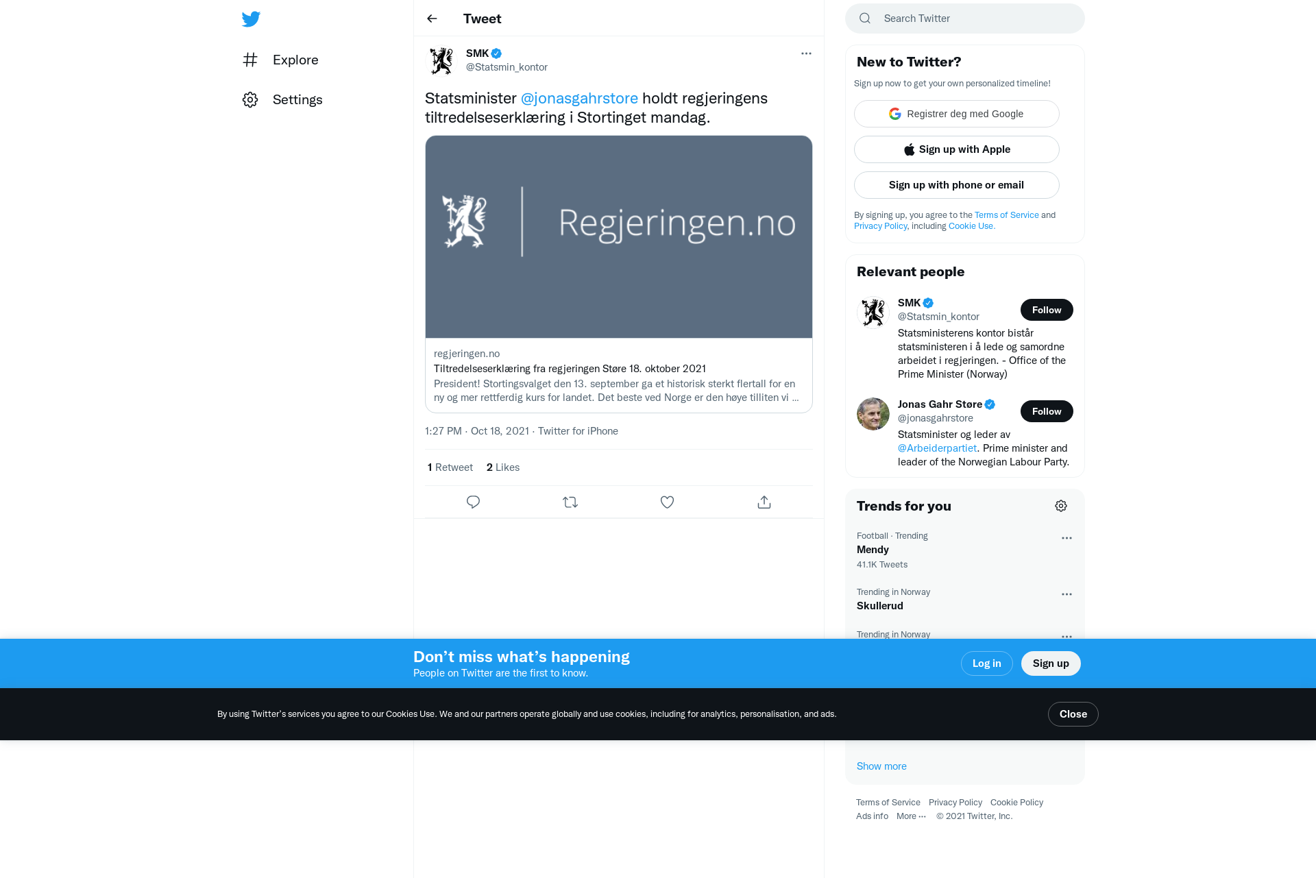 Tiltredelseserklæring fra regjeringen Støre 18. oktober 2021