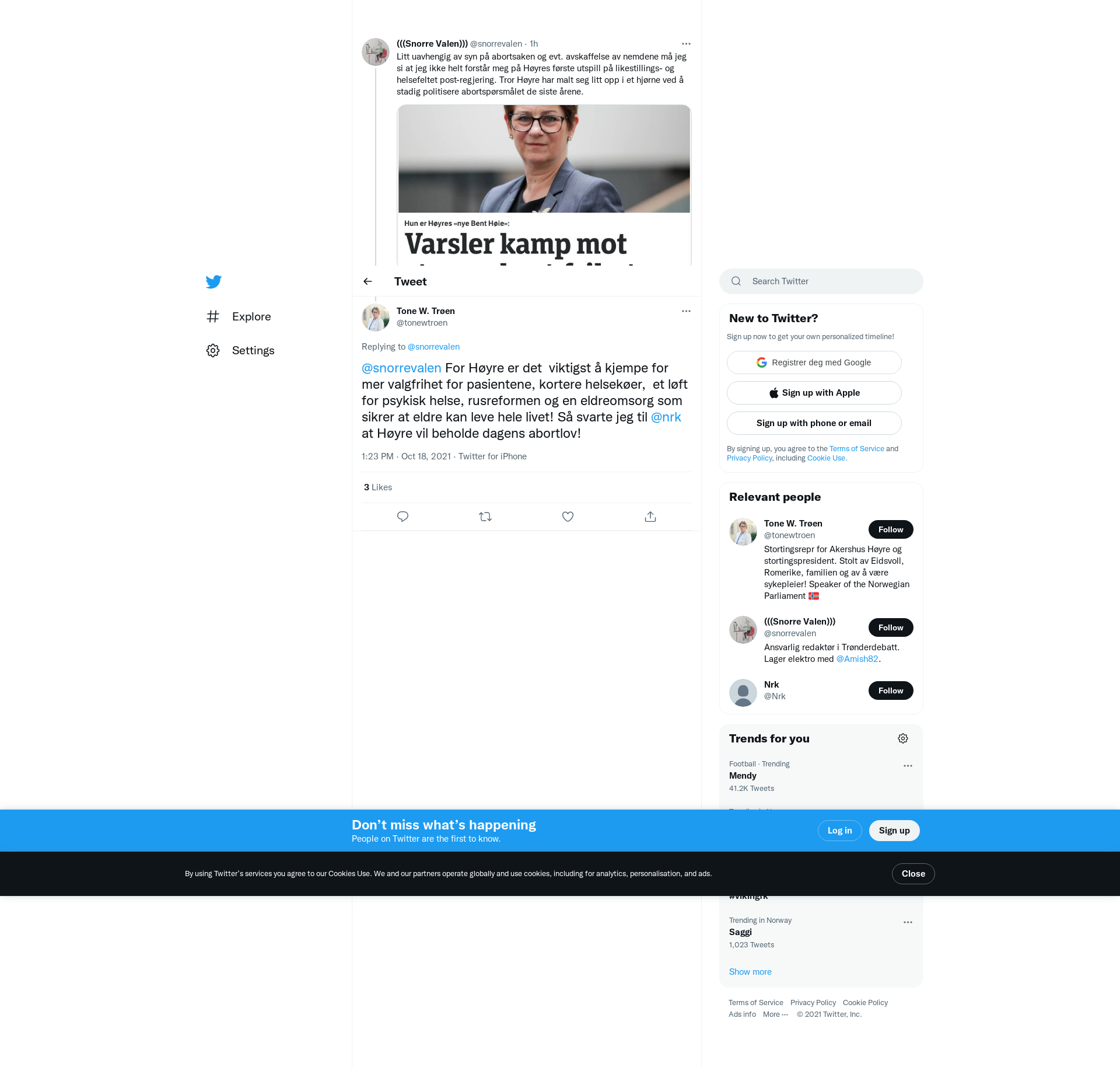 @snorrevalen @snorrevalen For Høyre er det viktigst å kjempe for mer valgfrihet for pasientene, kortere helsekøer, et løft for psykisk helse, rusreformen og en eldreomsorg som sikrer at eldre kan leve hele livet! Så svarte jeg til @nrk at Høyre vil beholde dagens abortlov!