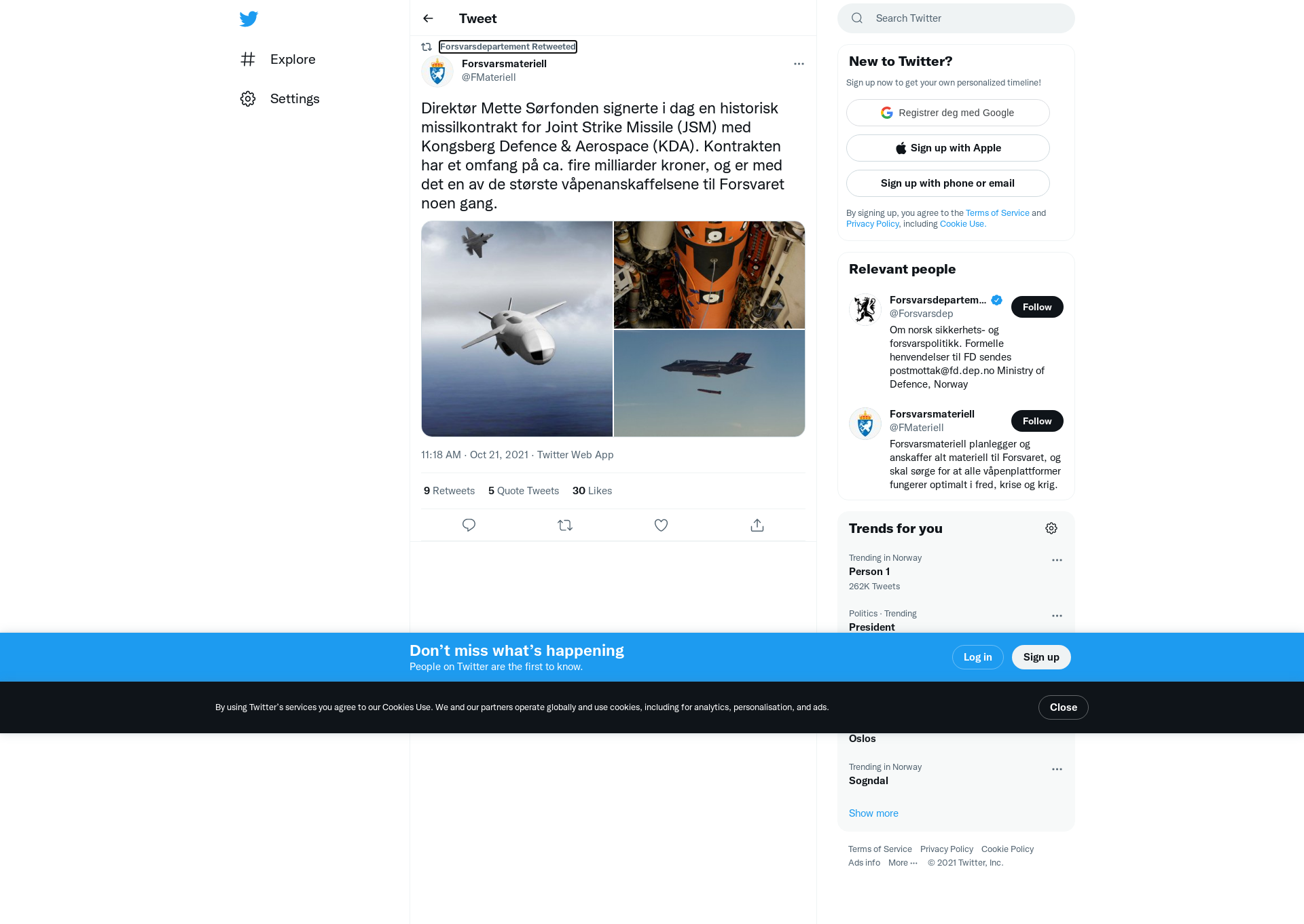 RT @FMateriell: Direktør Mette Sørfonden signerte i dag en historisk missilkontrakt for Joint Strike Missile (JSM) med Kongsberg Defence & Aerospace (KDA). Kontrakten har et omfang på ca. fire milliarder kroner, og er med det en av de største våpenanskaffelsene til Forsvaret noen gang. https://t.co/8ciHKMeITn