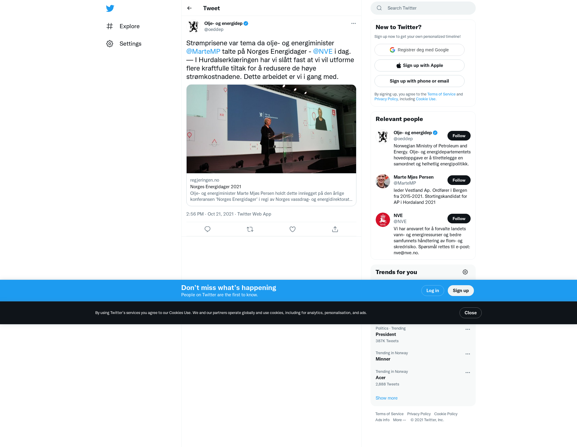 Olje- og energiminister Marte Mjøs Persen holdt dette innlegget på den årlige konferansen 'Norges Energidager' i regi av Norges vassdrag- og energidirektorat (NVE) på Scandic Hotel Fornebu 21. oktober 2021.