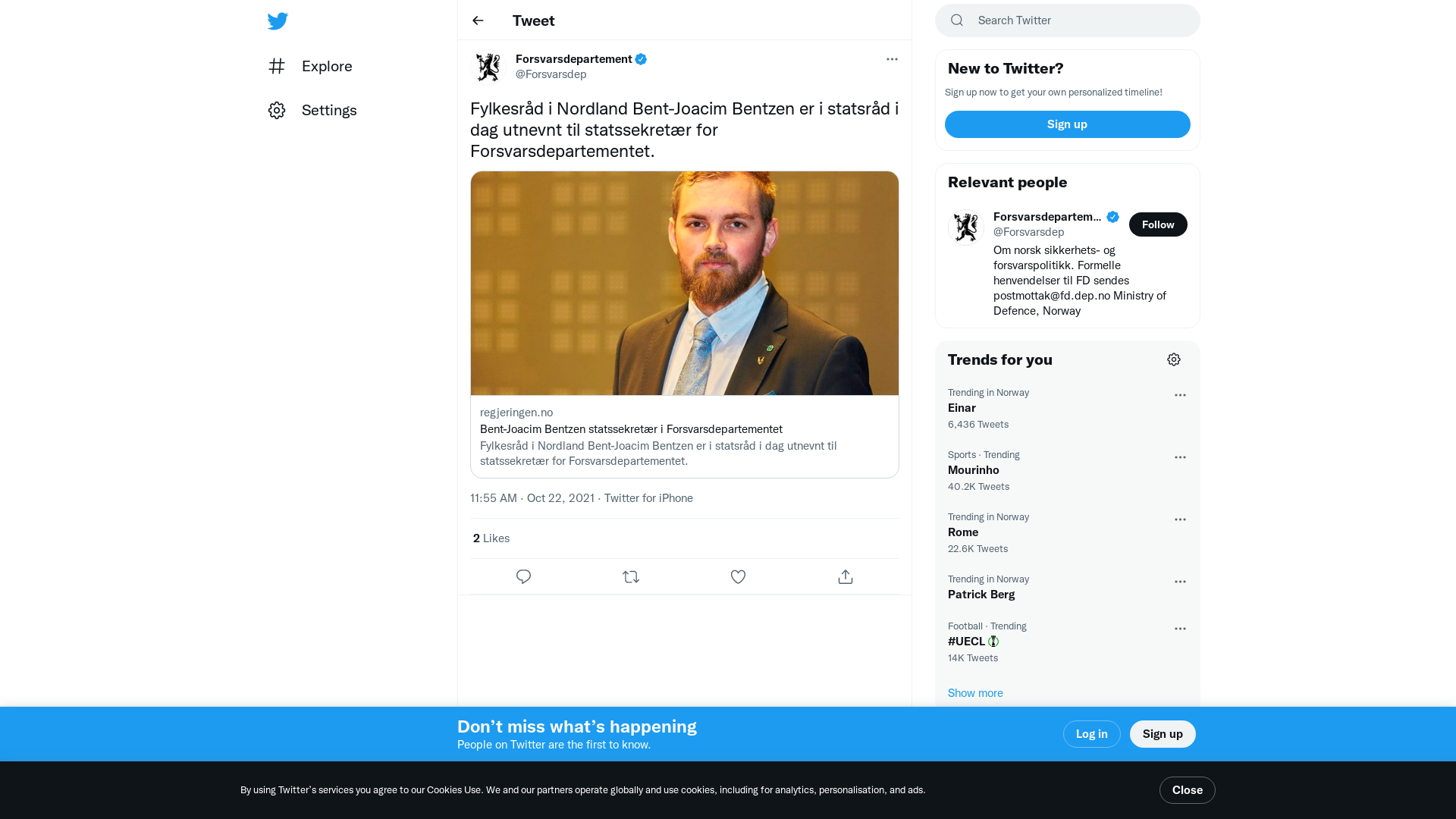 Fylkesråd i Nordland Bent-Joacim Bentzen er i statsråd i dag utnevnt til statssekretær for Forsvarsdepartementet. https://t.co/V55dIlq1KB