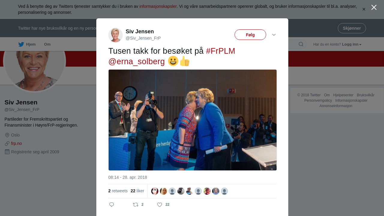 RT @Siv_Jensen_FrP: Tusen takk for besøket på #FrPLM @erna_solberg 😀👍 https://t.co/yFhuKxJtoU