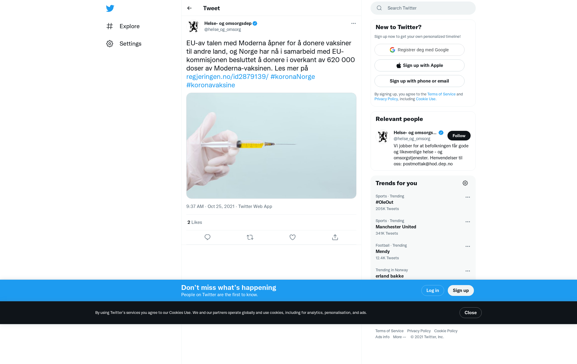 EU-avtalen med Moderna åpner for å donere vaksiner til andre land, og Norge har nå i samarbeid med EU-kommisjonen besluttet å donere i overkant av 620 000 doser av Moderna-vaksinen.