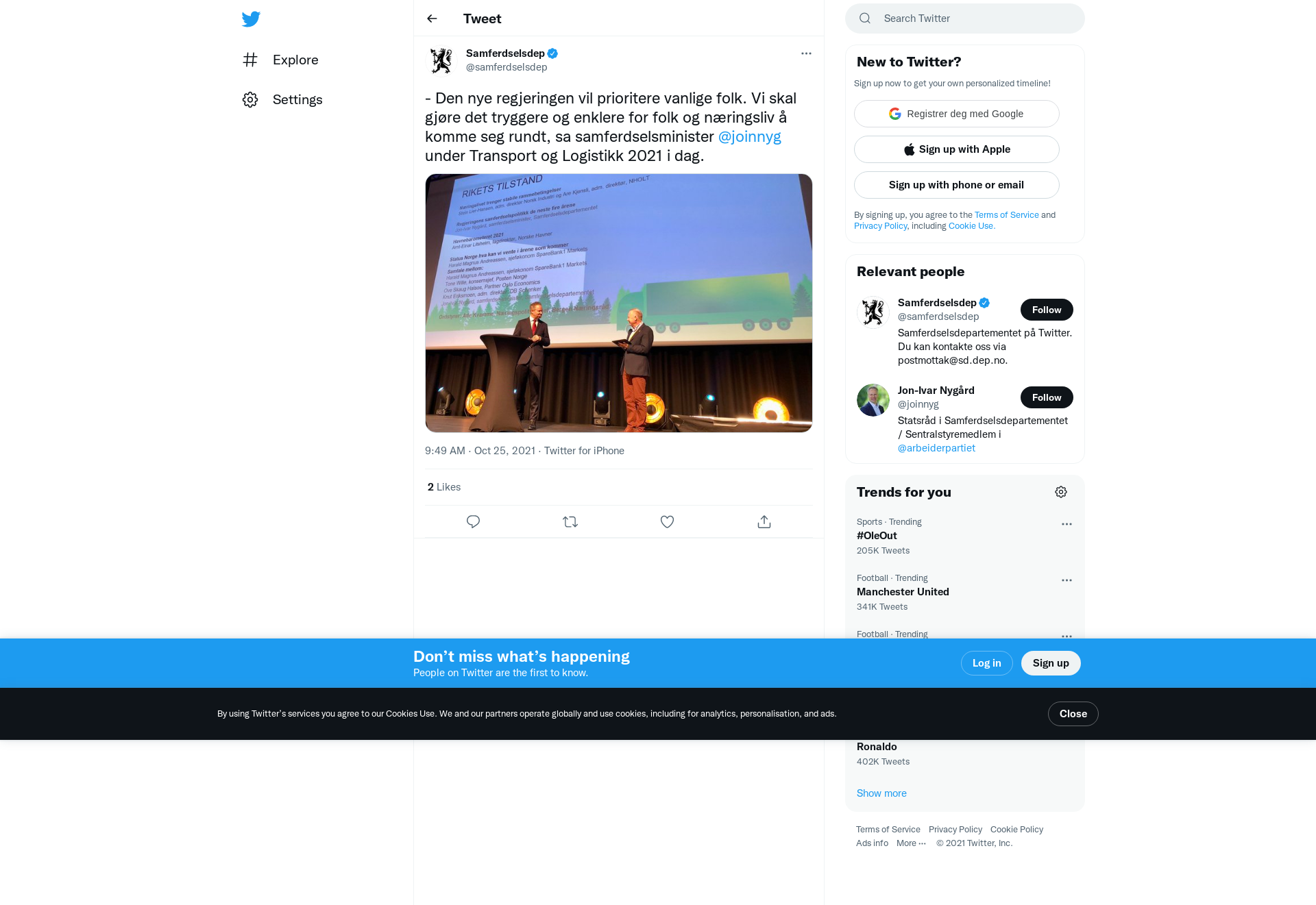 - Den nye regjeringen vil prioritere vanlige folk. Vi skal gjøre det tryggere og enklere for folk og næringsliv å komme seg rundt, sa samferdselsminister @joinnyg under Transport og Logistikk 2021 i dag. https://t.co/ETwQZRV4Wu