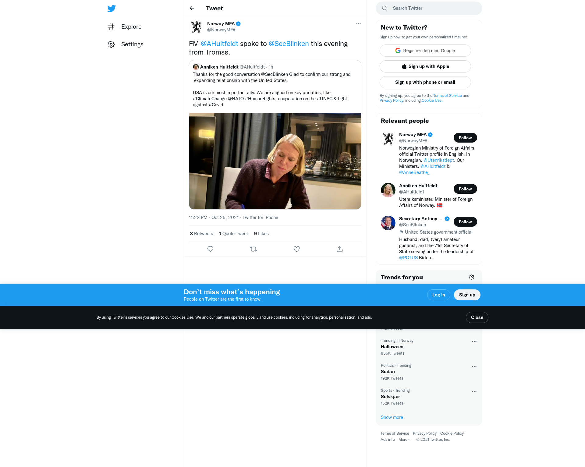 FM @AHuitfeldt spoke to @SecBlinken this evening from Tromsø.