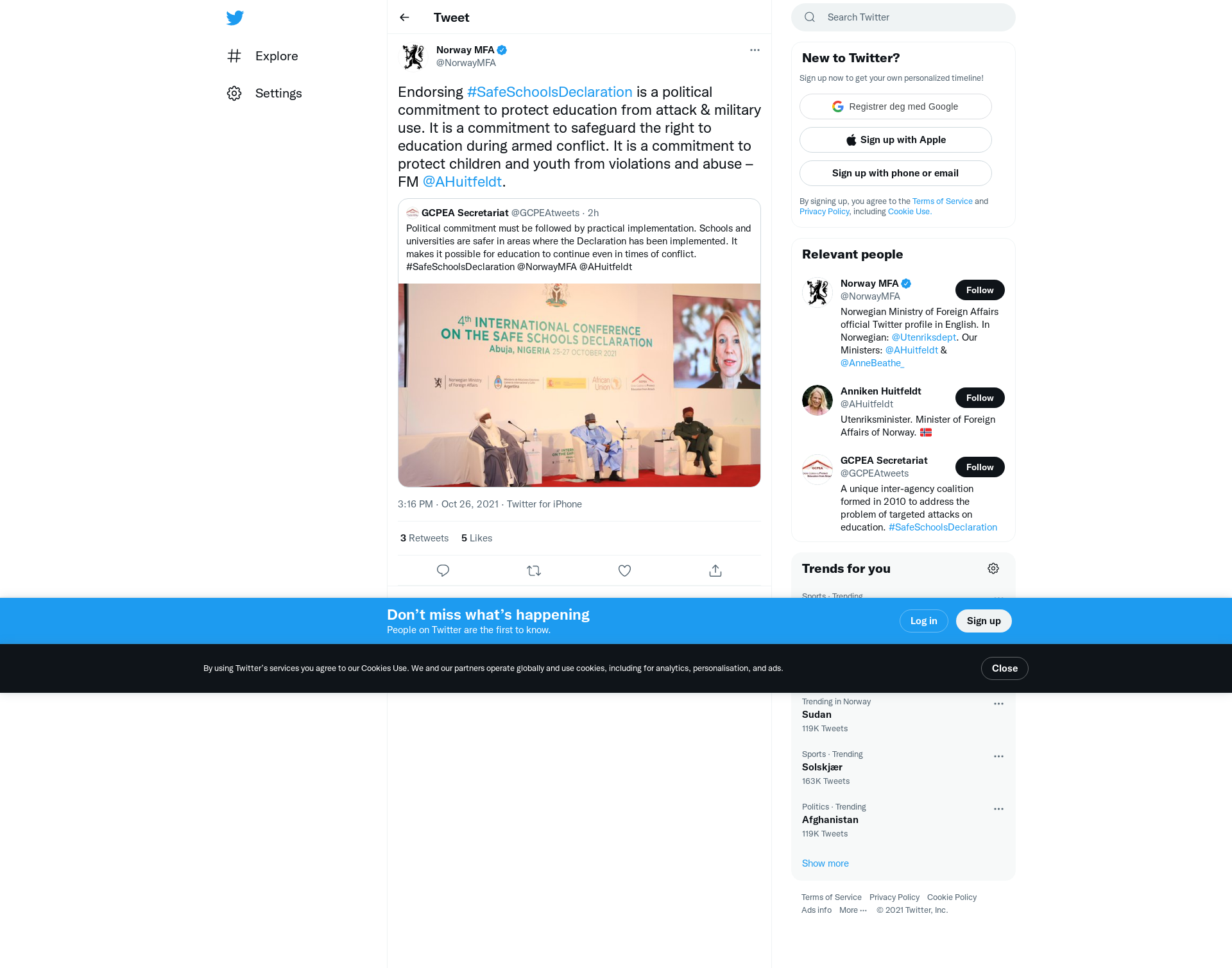 Endorsing #SafeSchoolsDeclaration is a political commitment to protect education from attack & military use. It is a commitment to safeguard the right to education during armed conflict. It is a commitment to protect children and youth from violations and abuse – FM @AHuitfeldt.