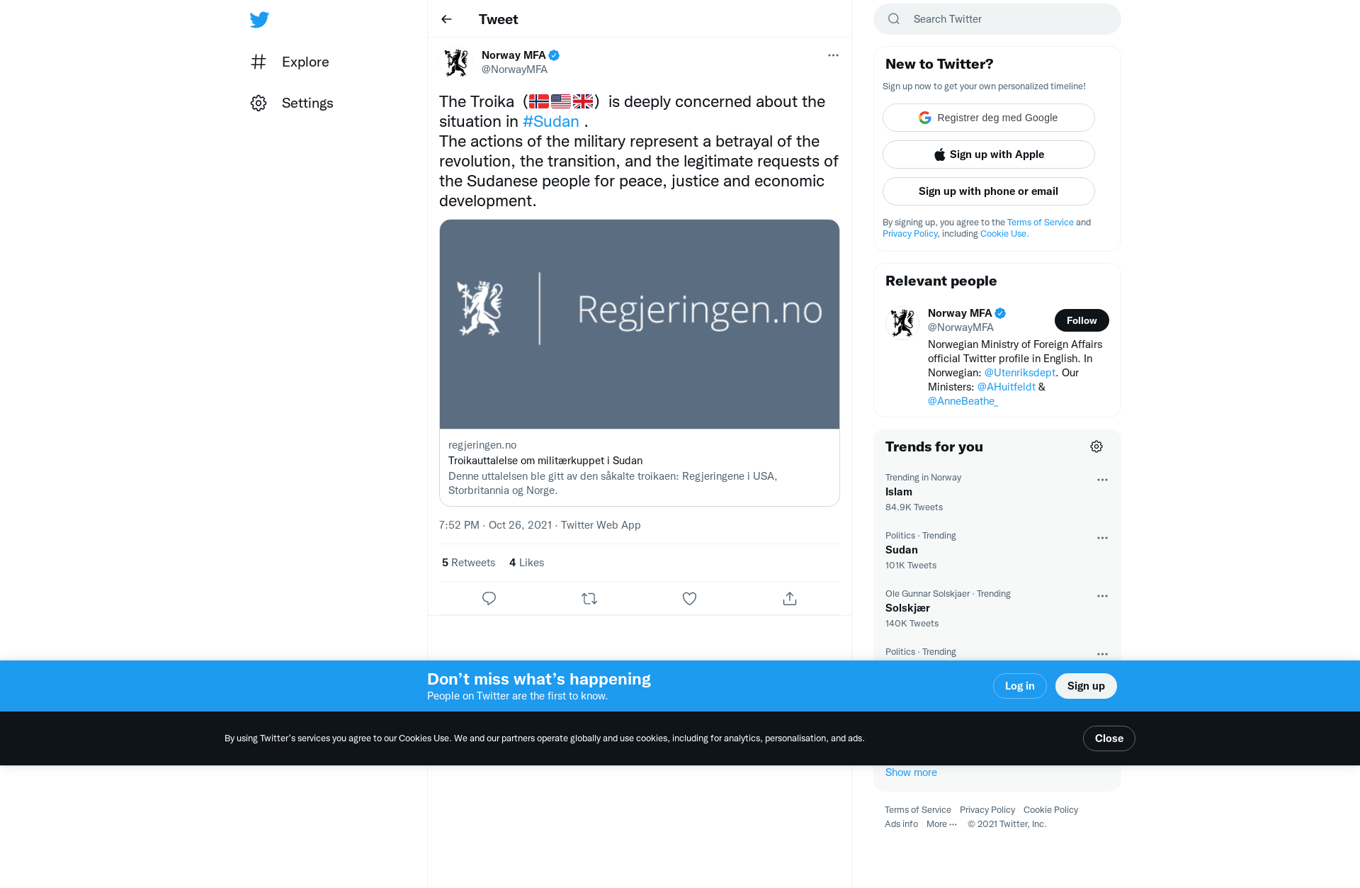 The Troika (🇳🇴🇺🇸🇬🇧) is deeply concerned about the situation in #Sudan .