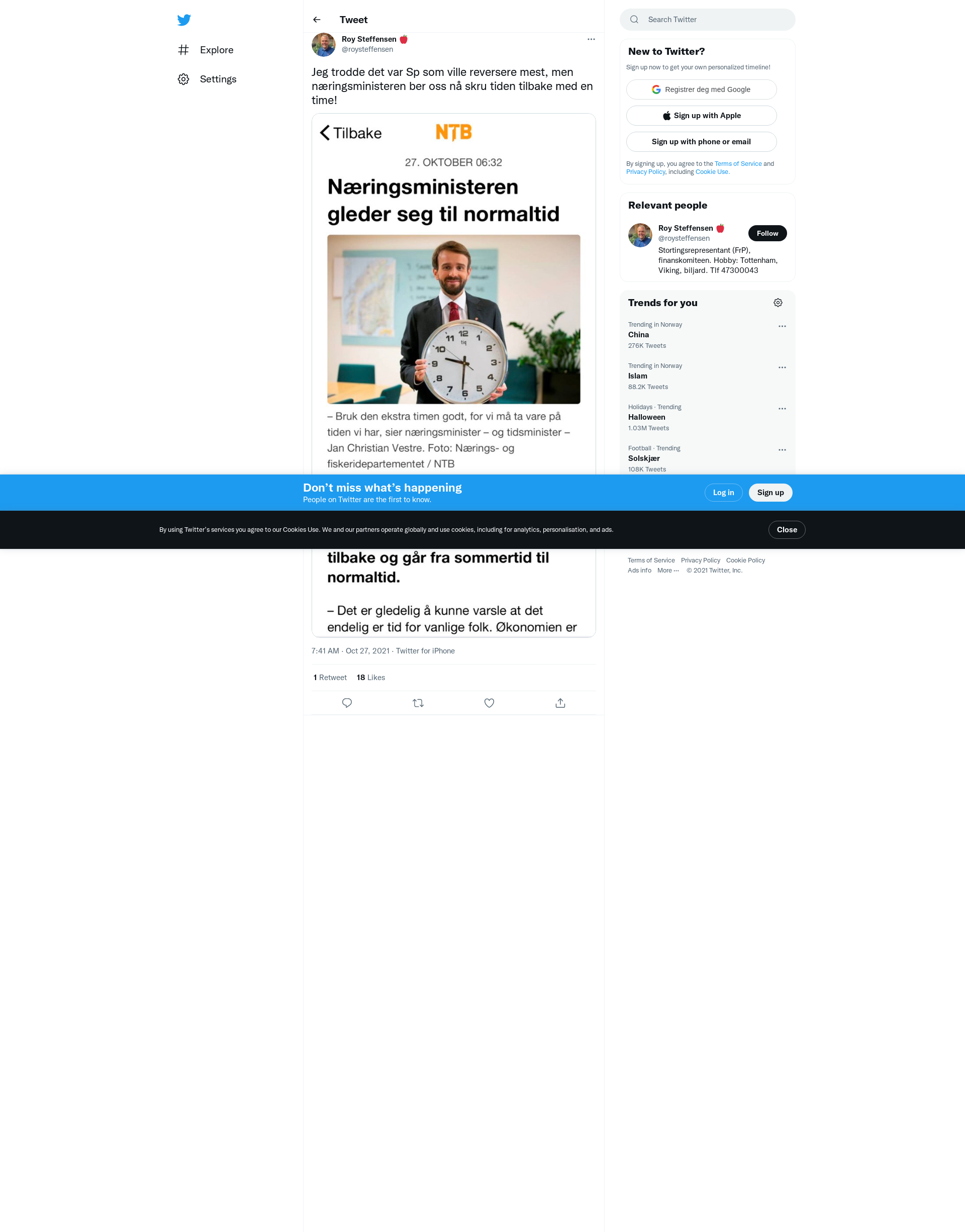 Jeg trodde det var Sp som ville reversere mest, men næringsministeren ber oss nå skru tiden tilbake med en time! https://t.co/bRV8YYp0fW