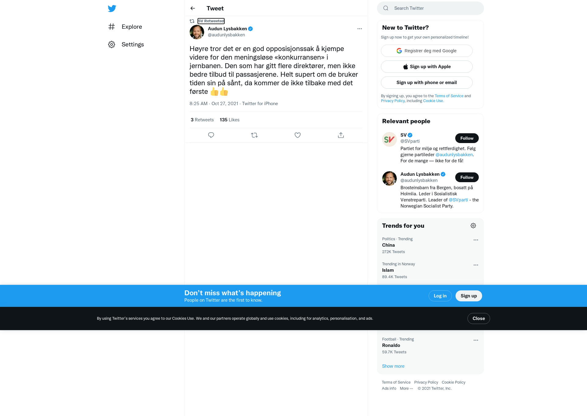 RT @audunlysbakken: Høyre tror det er en god opposisjonssak å kjempe videre for den meningsløse «konkurransen» i jernbanen. Den som har gitt flere direktører, men ikke bedre tilbud til passasjerene. Helt supert om de bruker tiden sin på sånt, da kommer de ikke tilbake med det første 👍👍