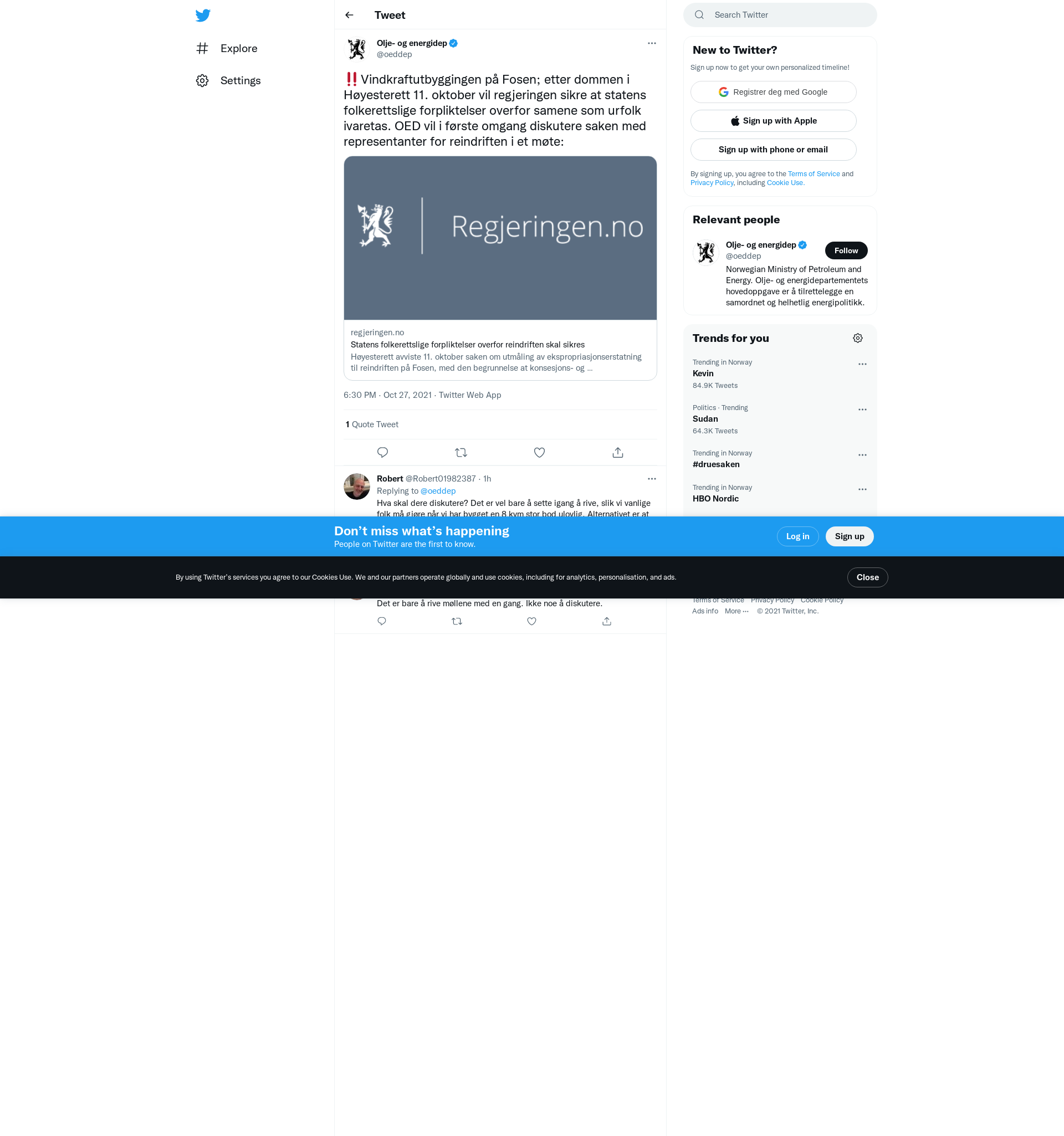 Høyesterett avviste 11. oktober saken om utmåling av ekspropriasjonserstatning til reindriften på Fosen, med den begrunnelse at konsesjons- og ekspropriasjonsvedtaket var ugyldig. Retten la til grunn at uten tilfredsstillende avbøtende tiltak, vil vind...