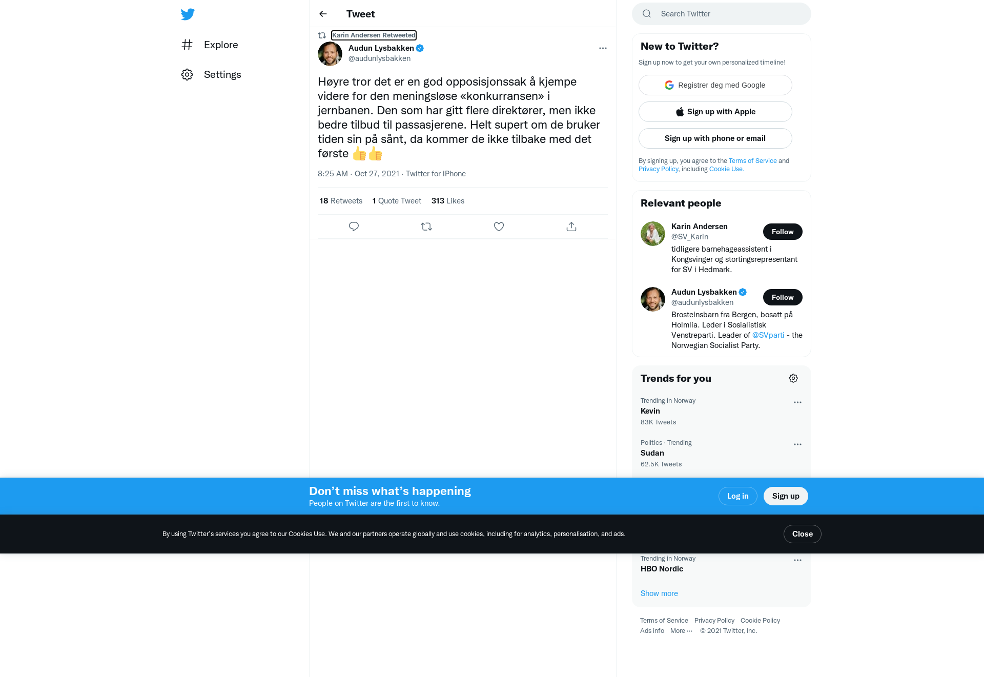 RT @audunlysbakken: Høyre tror det er en god opposisjonssak å kjempe videre for den meningsløse «konkurransen» i jernbanen. Den som har gitt flere direktører, men ikke bedre tilbud til passasjerene. Helt supert om de bruker tiden sin på sånt, da kommer de ikke tilbake med det første 👍👍