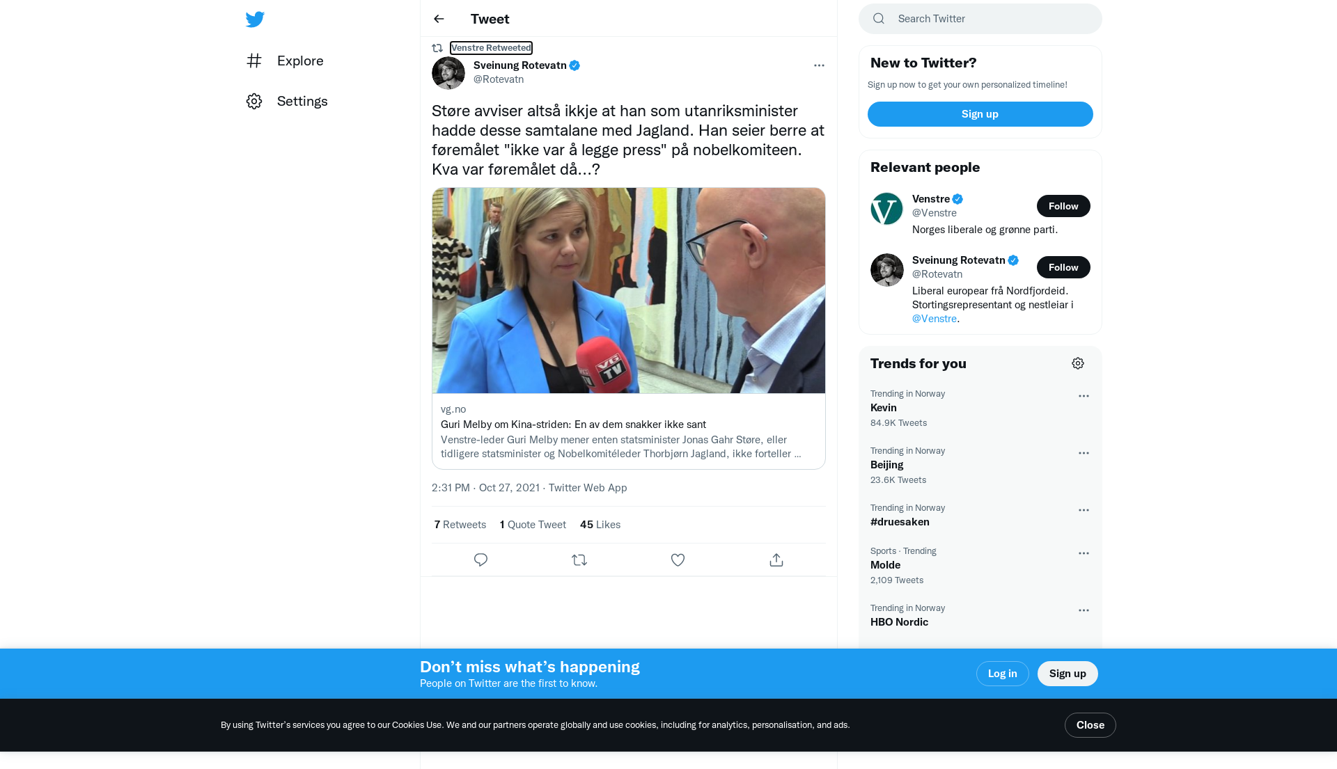 RT @Rotevatn: Støre avviser altså ikkje at han som utanriksminister hadde desse samtalane med Jagland. Han seier berre at føremålet "ikke var å legge press" på nobelkomiteen. Kva var føremålet då...? https://t.co/Mvqfk8FW6s
