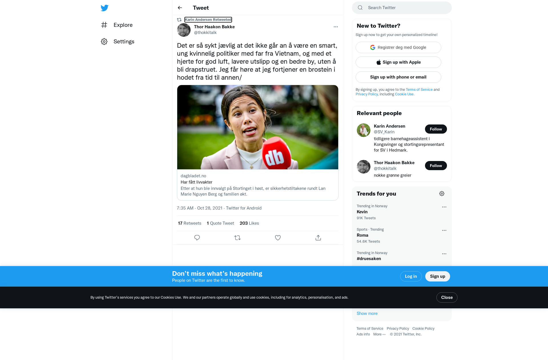 RT @thokkitalk: Det er så sykt jævlig at det ikke går an å være en smart, ung kvinnelig politiker med far fra Vietnam, og med et hjerte for god luft, lavere utslipp og en bedre by, uten å bli drapstruet. Jeg får høre at jeg fortjener en brostein i hodet fra tid til annen/ https://t.co/nDWJ0FOtOQ