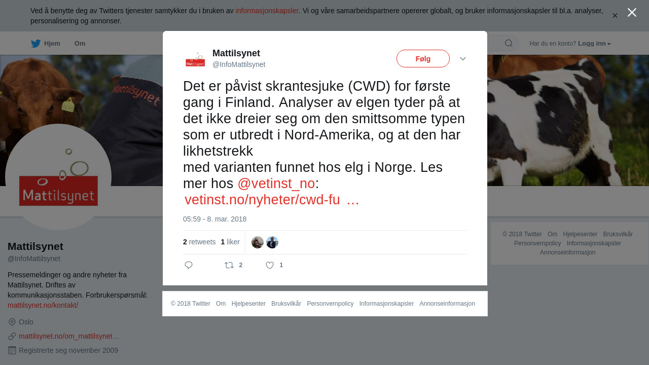 RT @InfoMattilsynet: Det er påvist skrantesjuke (CWD) for første gang i Finland. Analyser av elgen tyder på at det ikke dreier seg om de… https://t.co/vgFiQCEXab