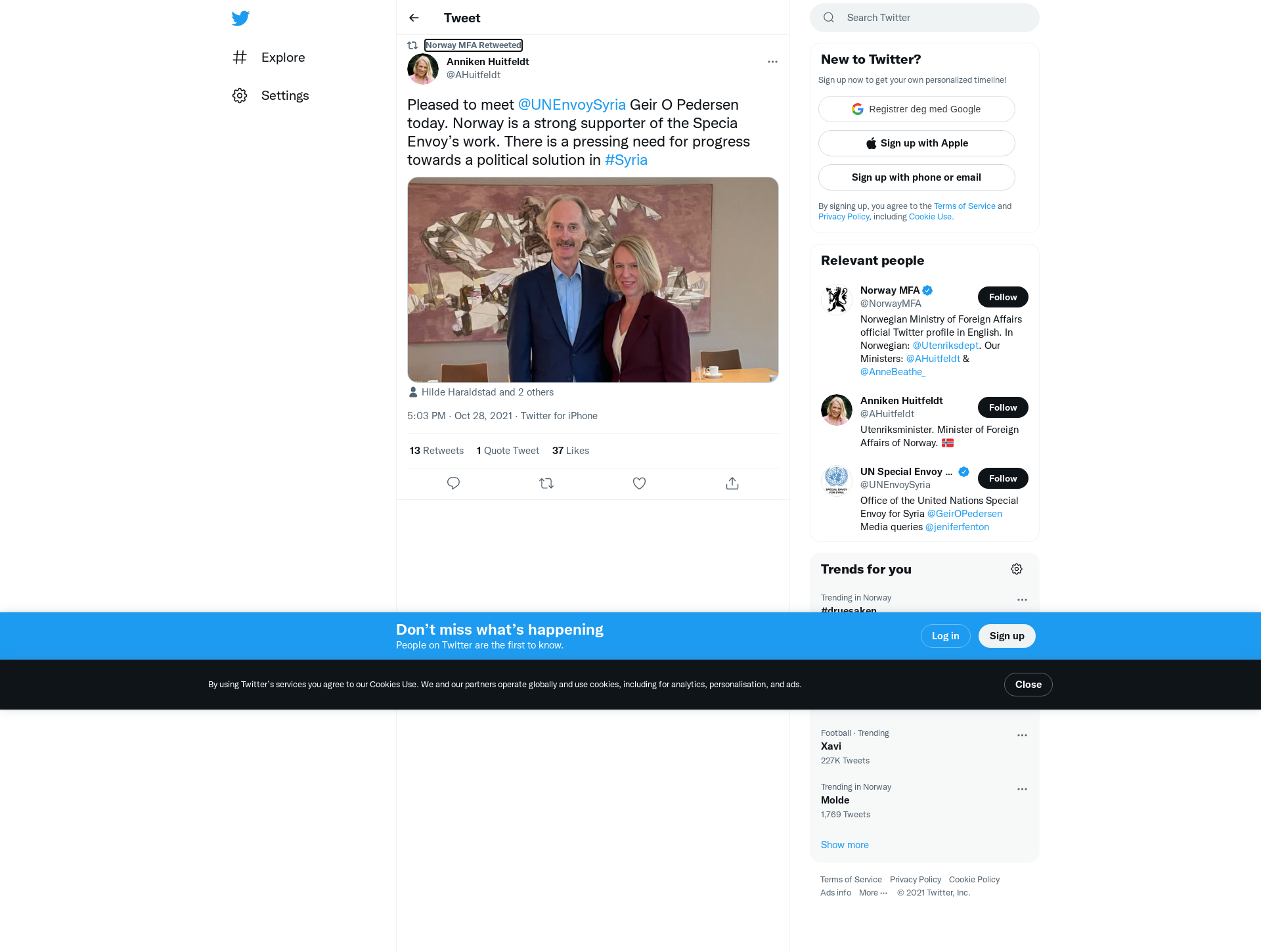RT @AHuitfeldt: Pleased to meet @UNEnvoySyria Geir O Pedersen today. Norway is a strong supporter of the Specia Envoy’s work. There is a pressing need for progress towards a political solution in #Syria https://t.co/ZVknbYBKIm