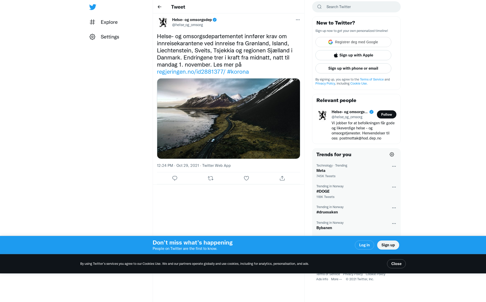Helse- og omsorgsdepartementet innfører krav om innreisekarantene ved innreise fra Grønland, Island, Liechtenstein, Sveits, Tsjekkia og regionen Sjælland i Danmark. Endringene trer i kraft fra midnatt, natt til mandag 1. november. Les mer på https://t.co/WHYIK3h0hK #korona https://t.co/bc2TKc6Z6t