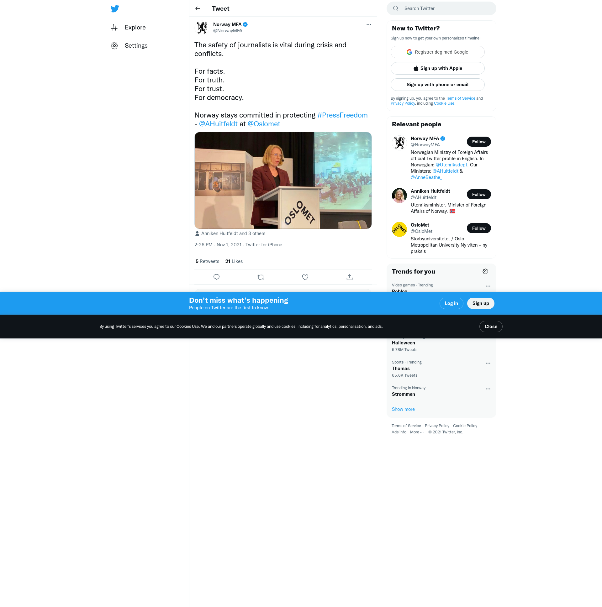 Norway stays committed in protecting #PressFreedom - @AHuitfeldt at @Oslomet https://t.co/B1CyY1sMM2