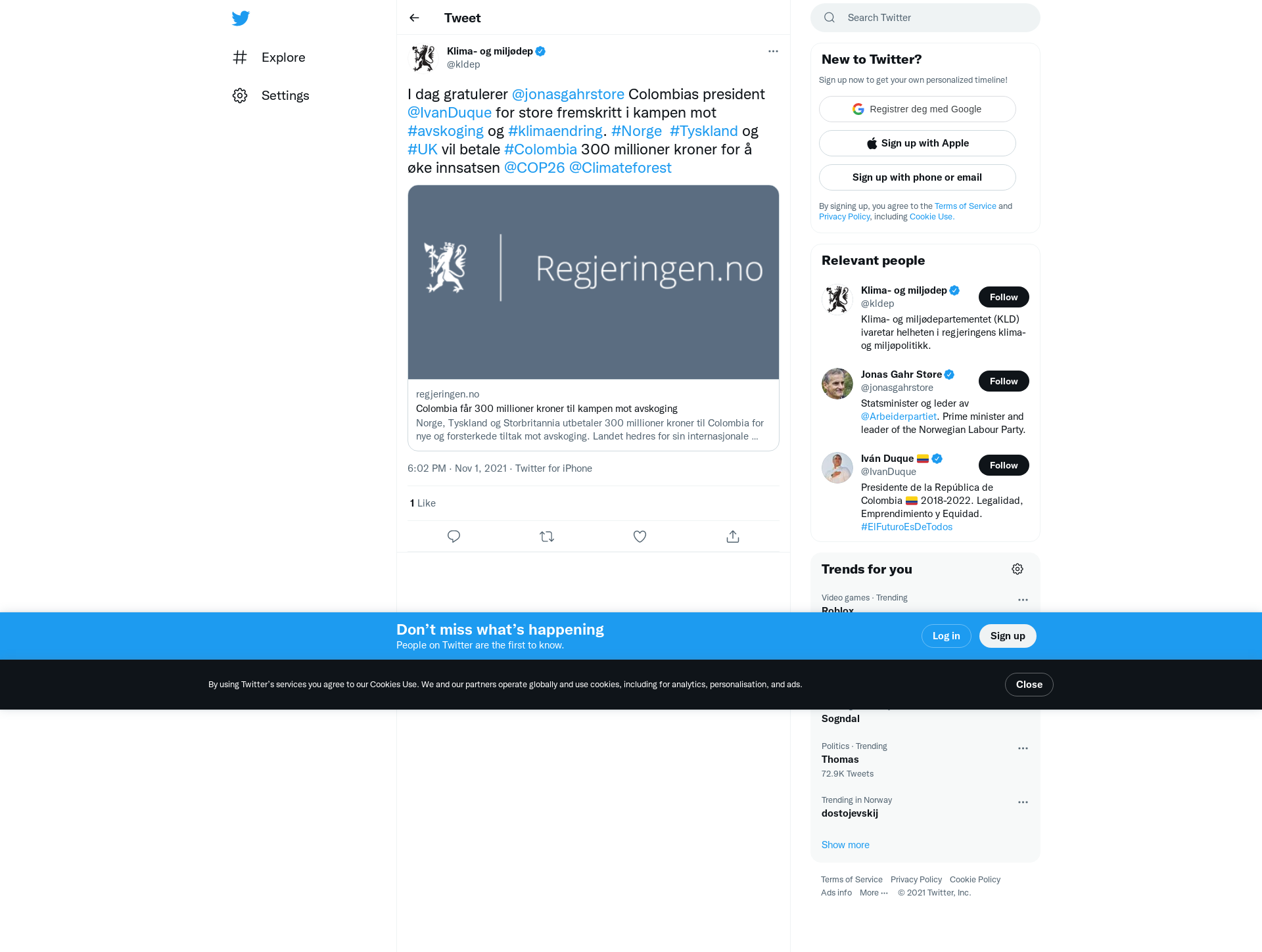 Norge, Tyskland og Storbritannia utbetaler 300 millioner kroner til Colombia for nye og forsterkede tiltak mot avskoging. Landet hedres for sin internasjonale lederrolle innen skogbevaring.